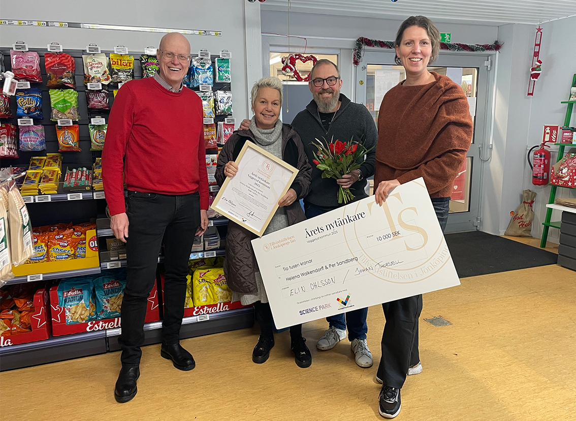 På fredagseftermiddagen fick Helena och Per ett något oväntat besök i butiken i Hok. Det var Elin Ohlsson, affärsutvecklare från Science Park och Johan Thorsell, näringslivschef Vaggeryds kommun, som kom med blommor, diplom och en storstilad check på 10 000 kronor – överraskande för både Helena och Per, men mycket glädjande.