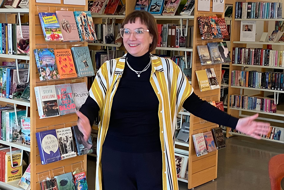 I nästa andetag berättar hon om hur imponerad hon är av biblioteksverksamheten som finns i kommunen.