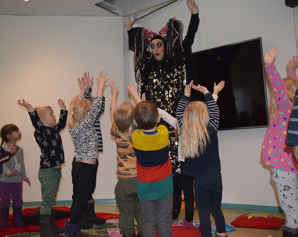 Innan sagostunden "Bland drakar och dragqueens" började skulle uppvärmning göras. Alla barnen värmde upp genom att vinka med armar och ben med stor inlevelse och förtjusning innan man fick sätta sig på kuddarna för att lyssna på sagoboken som skulle läsas.