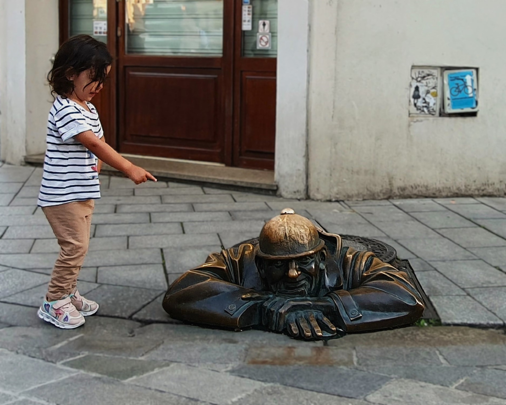 ”En berättande gatubild med humor och kontrast. Pekgesten är perfekt tajmad. Barnets kroppsspråk känns spontant och äkta. Bilden känns inte arrangerad, vilket är centralt i gatufoto. En stark kontrast mellan det livfulla barnet och den stilla, nästan spöklika skulpturen. Man kan inte låta bli att fundera över vilka tankar som far igenom det lilla barnets huvud.
