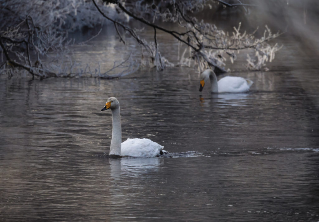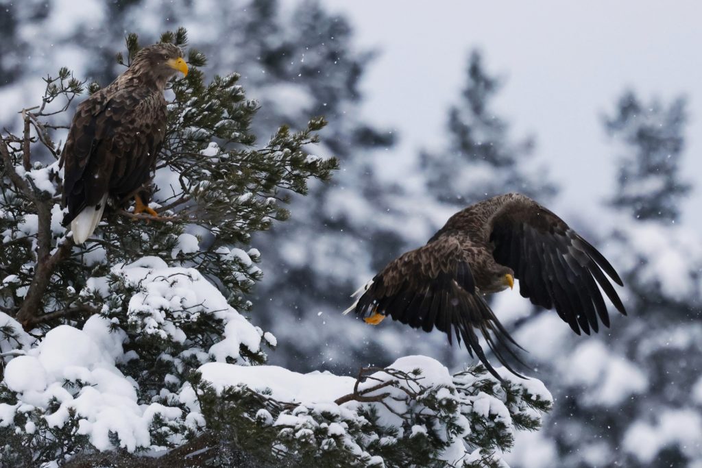 Den vita snön och de mörka träden ramar in örnarna och skapar en fin miljö runt dem. De små snöflingorna i luften gör att man nästan kan känna vädret. Att bakgrunden är oskarp gör att huvudmotivet med fåglarna lyfts fram på ett bra sätt. Bilden skulle vinna på att man lättade upp skuggorna en aning för att få detaljer i de vackra fåglarna att framträda bättre. Framför allt fåglarna känns nu lite för mörka. Med en sådan justering hade bilden fått förstaplatsen”.