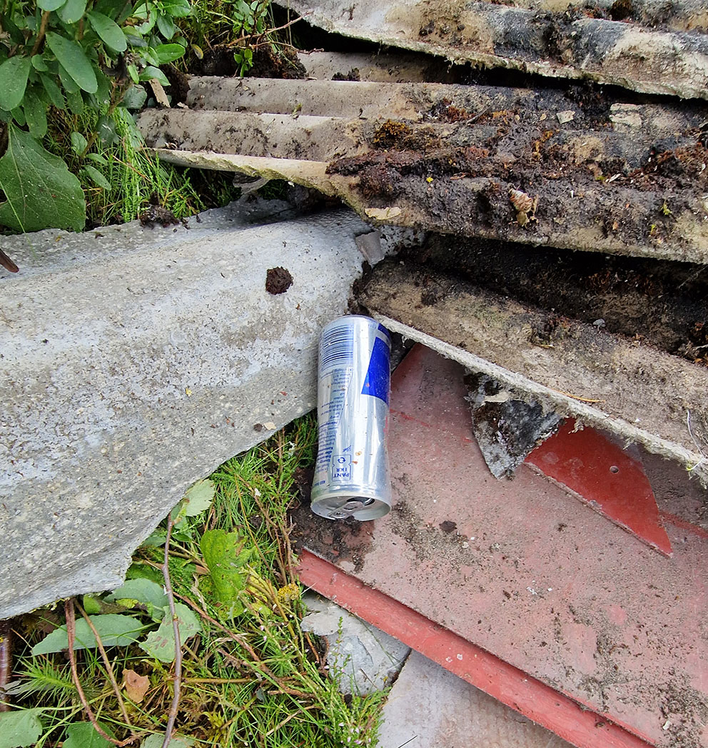Färska hjulspår leder in till skogsvägen på kyrkans mark där ett rejält lass med eternitplattor dumpats.