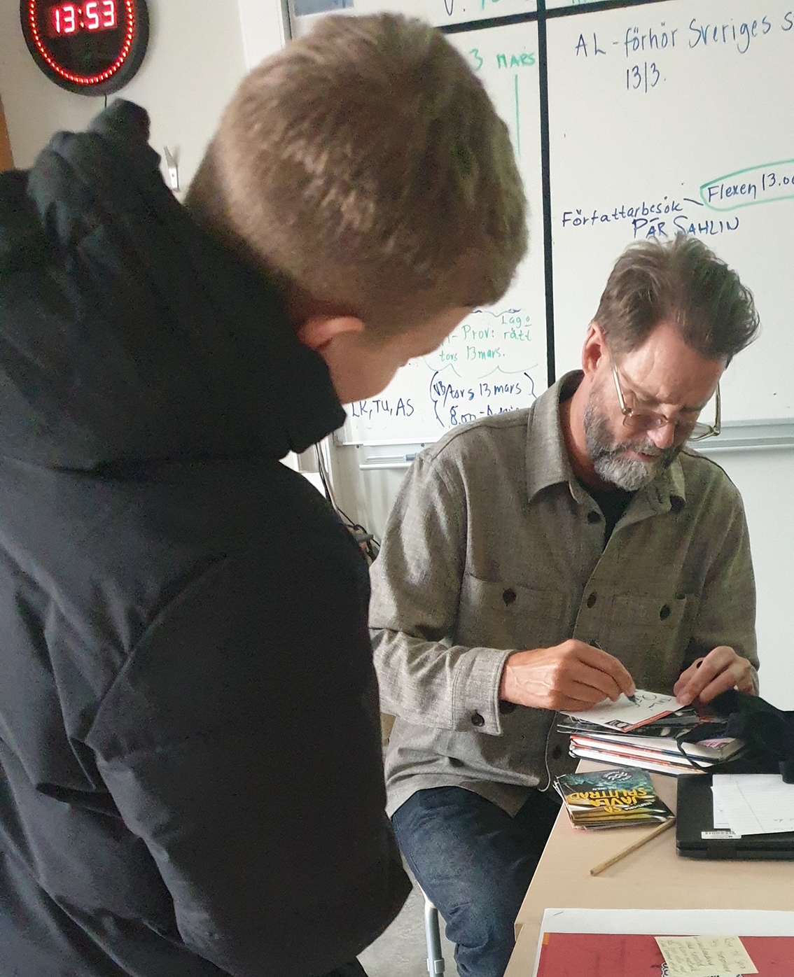 Efter storföreläsningen var det workshops i klassrummen. Pär visade eleverna hur en berättelse byggs upp genom att först skapa en egen huvudperson och sedan skapa en konflikt och därefter en konfliktupplösning. Sedan fick eleverna börja att skriva en egen berättelse. Det var hög aktivitet under dessa workshops och Pär fick alla att komma igång med sin skrivning på ett lättsamt och medryckande vis.