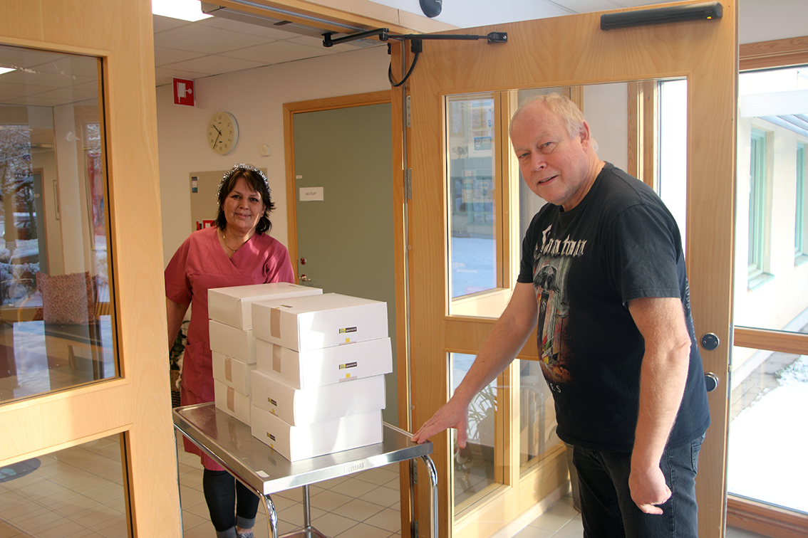 Tidningen följde med till äldreboendet Linneberg, där Shemsije Magjera och Per L'Allemand tog emot tårtorna från Kjell och Lena Karlsson.