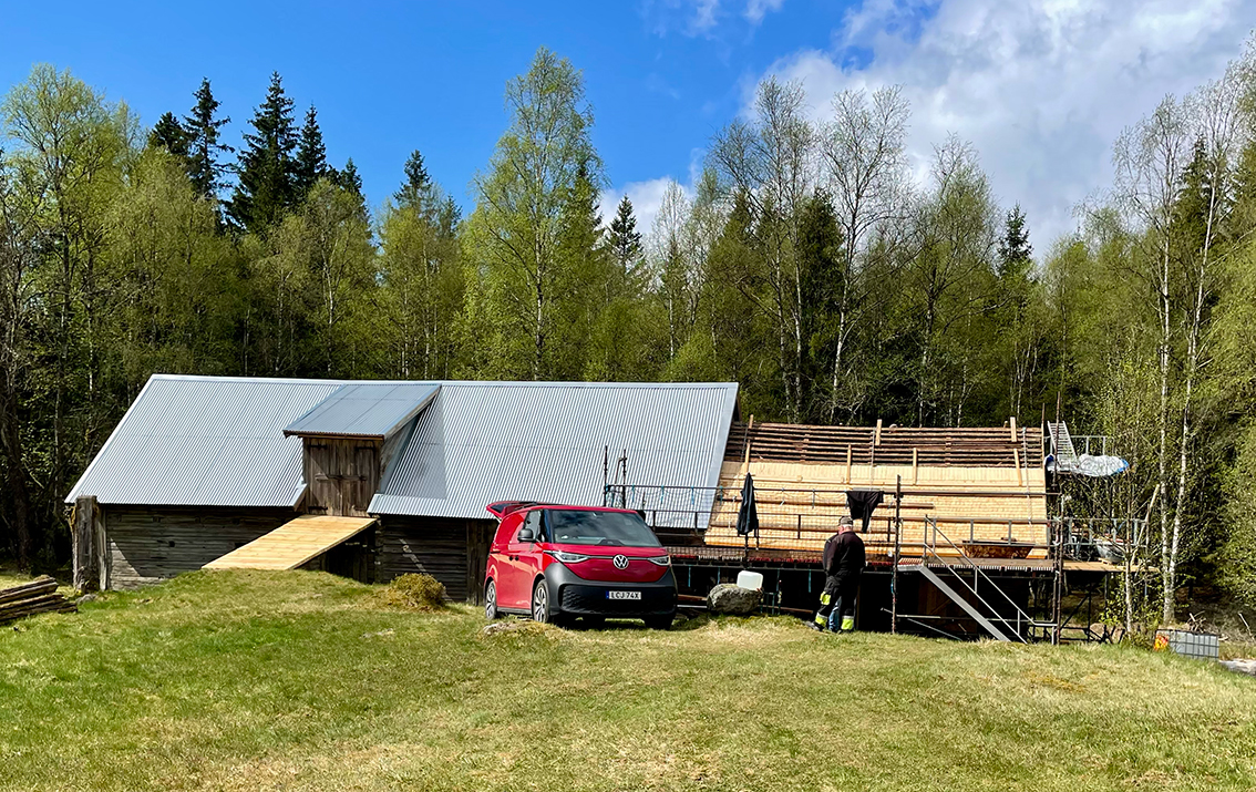 Vid det gamla vagnsskjulet finns stadiga byggnadsställningar uppsatta, och i stora badkar låg stickorna till taket i blöt.