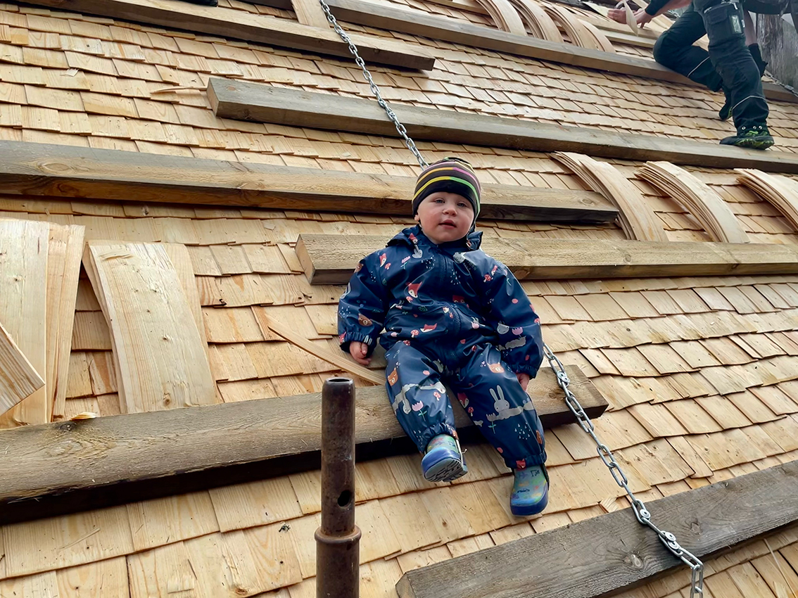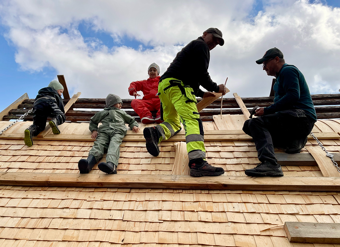 – Sticketak är kanske lite förlegat, men har ett stort kulturhistoriskt värde. Det är jättekul att vi kan lägga det här. Det är en täckningsteknik som användes för ladugårdar och enklare byggnader, men även som undertak under taktegel. Det tak vi lägger här är ett femlagers sticketak, där stickorna är 50 centimeter långa, och den synliga delen är 10 centimeter. Det går åt cirka 8 500 stickor till detta tak. Man använder gran, och det är ganska höga krav på att det ska vara en välvuxen gran, och det får inte vara något ”tjurigt” i det.
