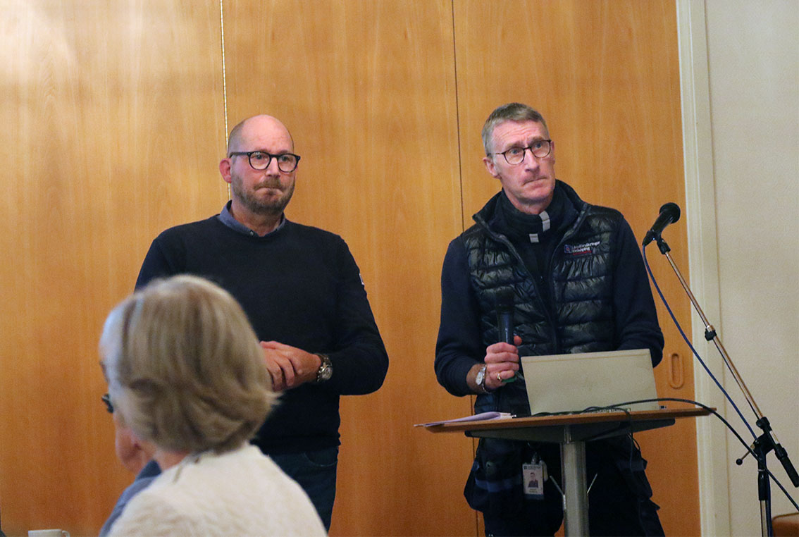 Ett 20-tal människor hade tagit sig till Allianskyrkan i Värnamo för att lyssna till de inbjudna föreläsarna. Först ut var skadereglerarna Jonas Ander och Lennart Sundberg på Länsförsäkringar, , som pratade om brottsstatistik och grannsamverkan.