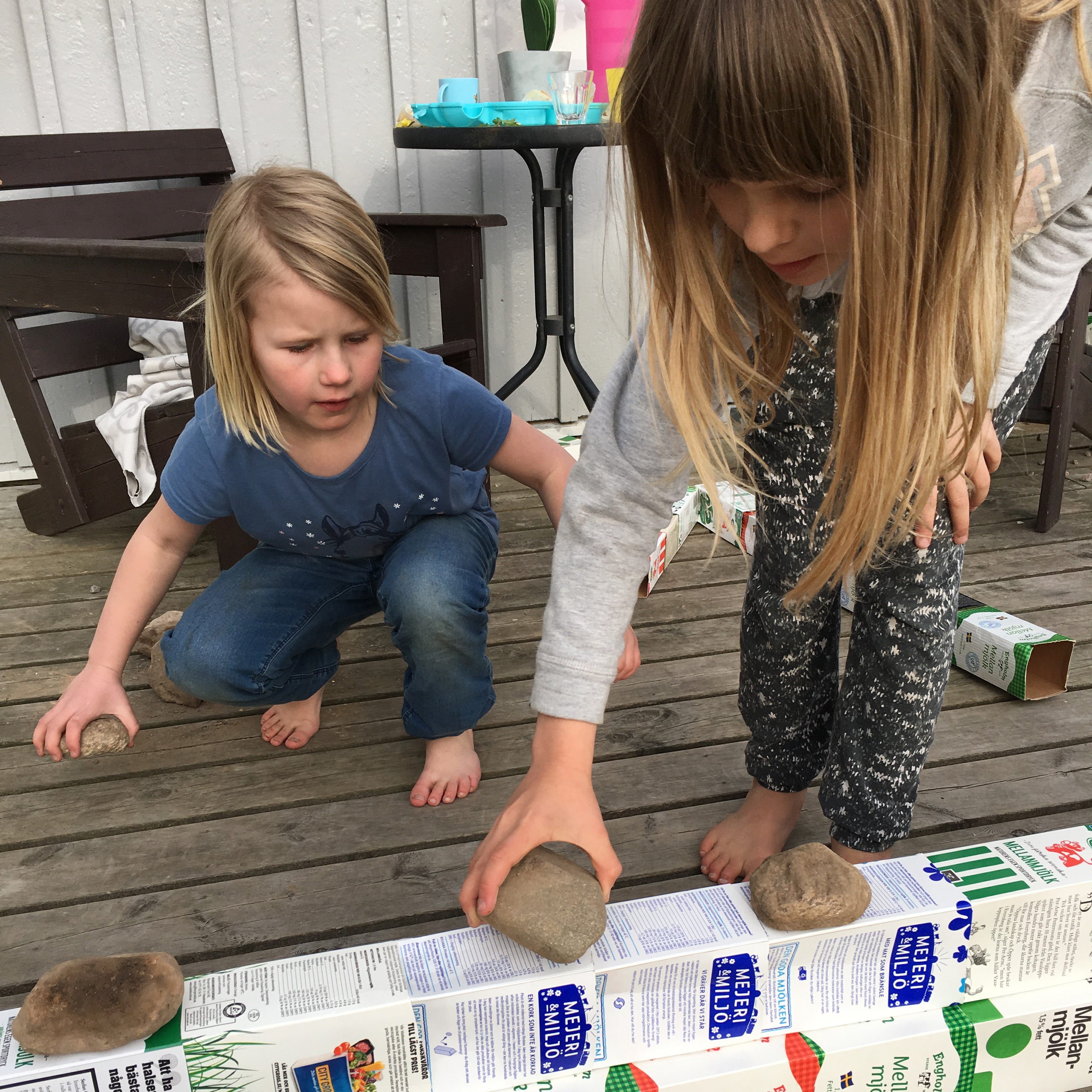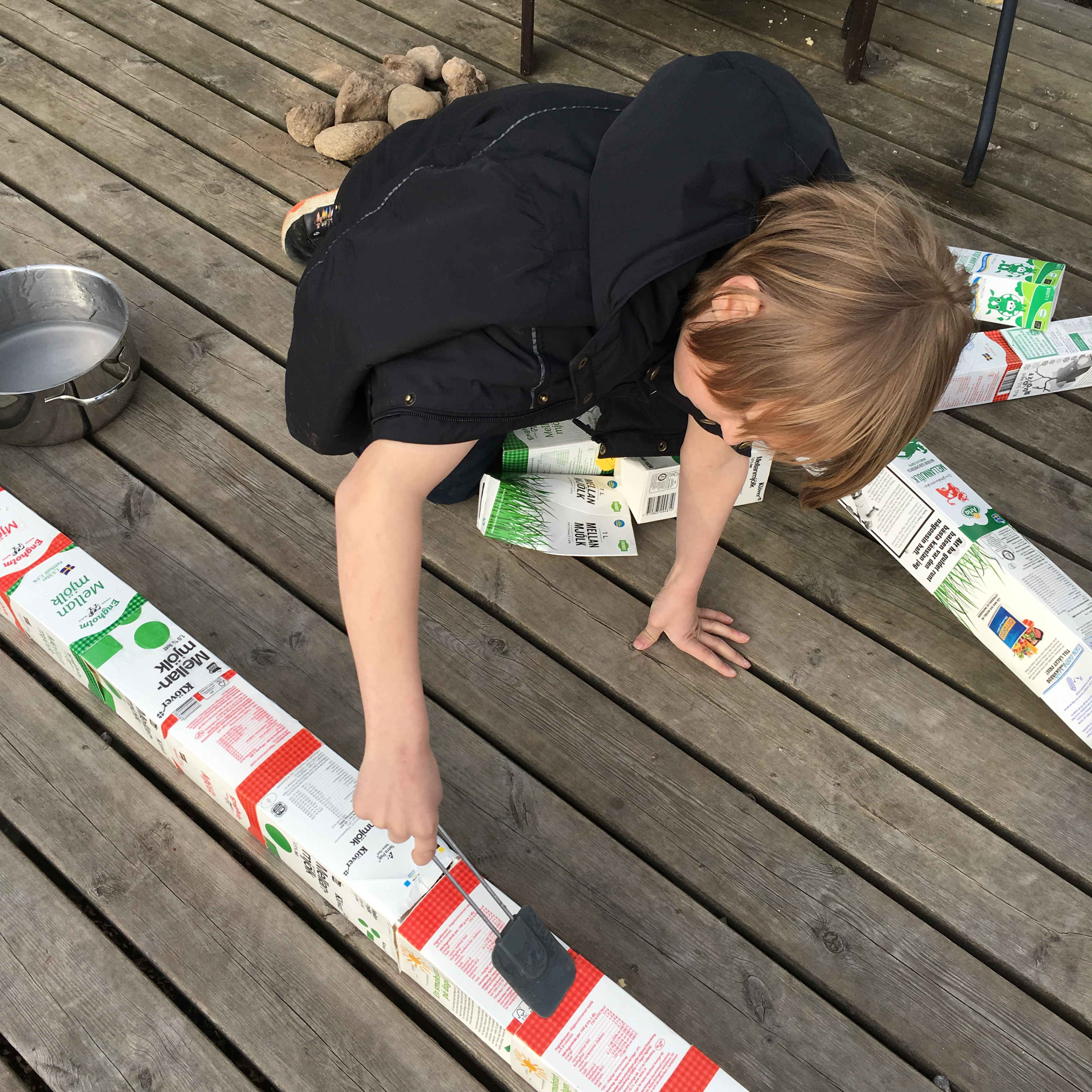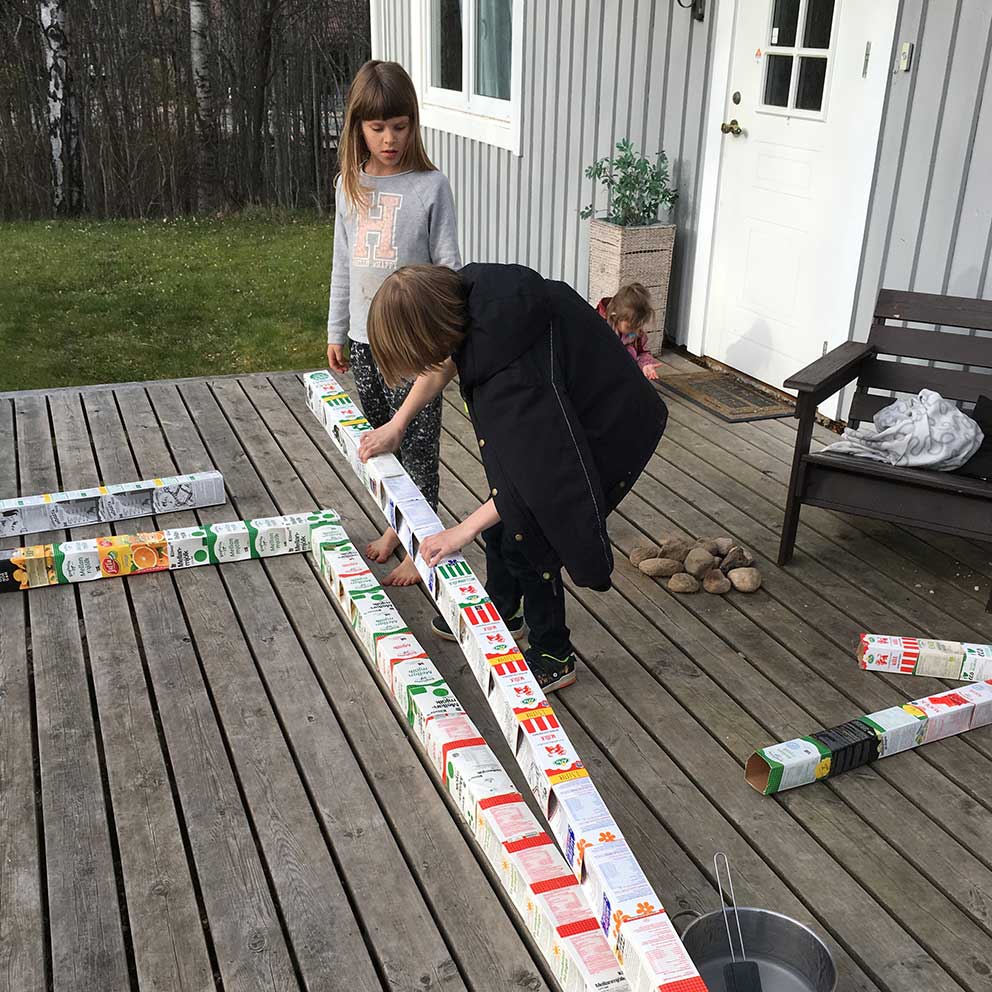 Hela familjen Leyes-Vidén, som består av mamma och pappa, Simon, 10 år, Julia, 9 år, Alva, 8 år och Freja, 3 år, hjälptes sedan åt att montera ihop väggar med att trä kartonger i varandra till långa "brädor" som sedan limmades ihop med trälim. Det blev även två fönster, ribbtak som täcktes med plast och även en fin veranda.