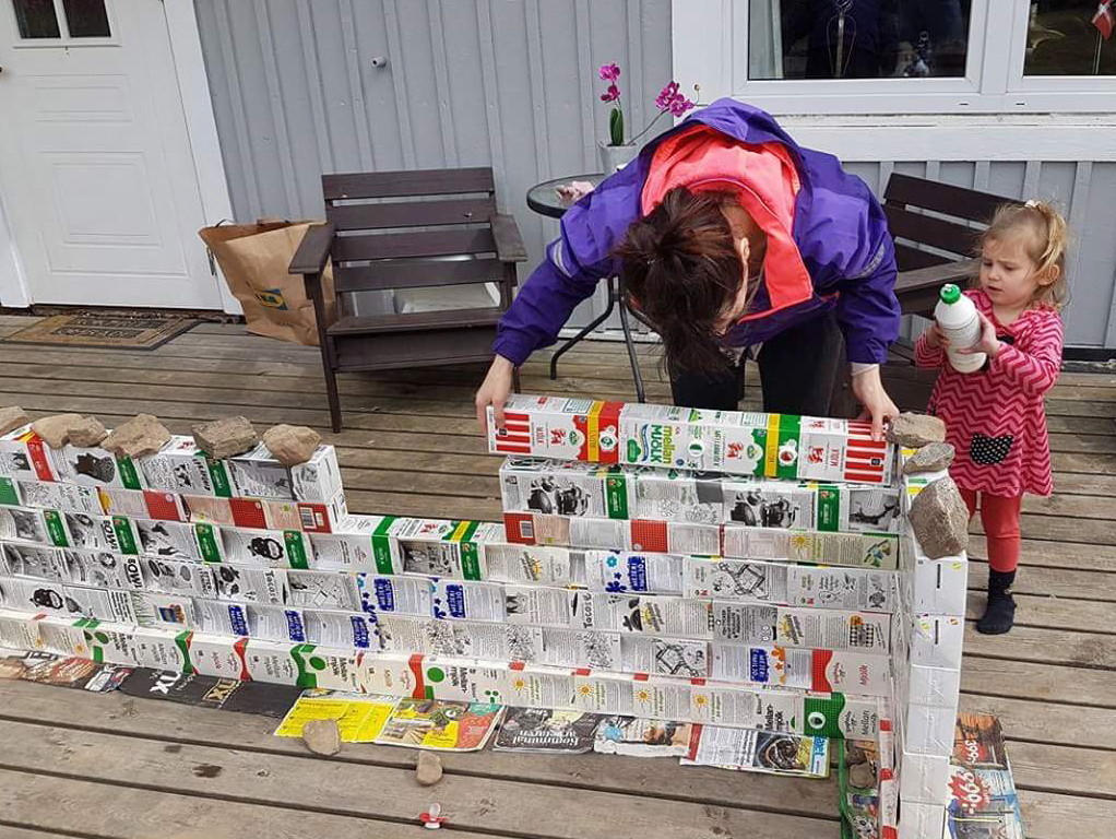 Mamma Elena utbildar sig till miljöanalytiker och tycker att samhället ska försöka se avfall som en resurs. Och med en familj på sex personer går det åt ganska mycket mjölk, så de började spara allehanda tetrakartonger för att bygga sig ett hus. De fick också hjälp av familjen Andersson i Vaggeryd som de tackar för hjälpen med samlandet.