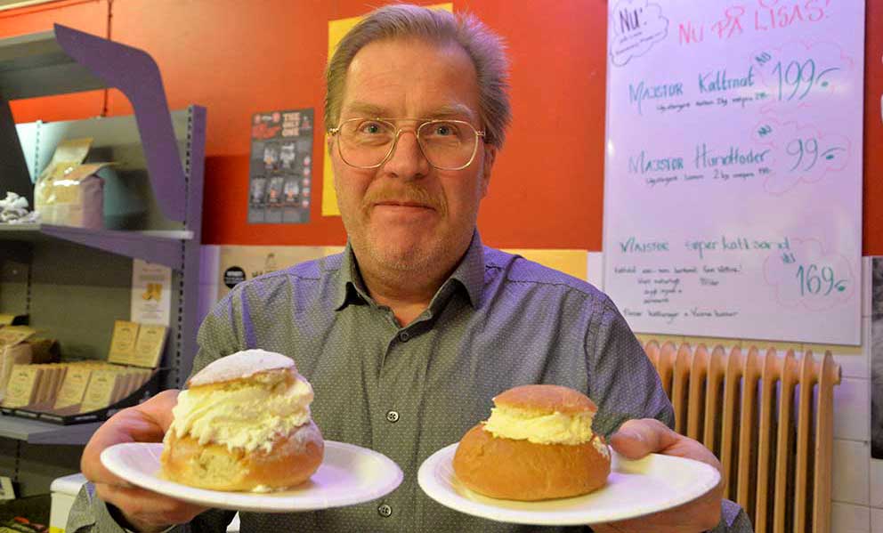 Mikael Schröder med en färsk semla och en semla som överlevt ett år i kylen.