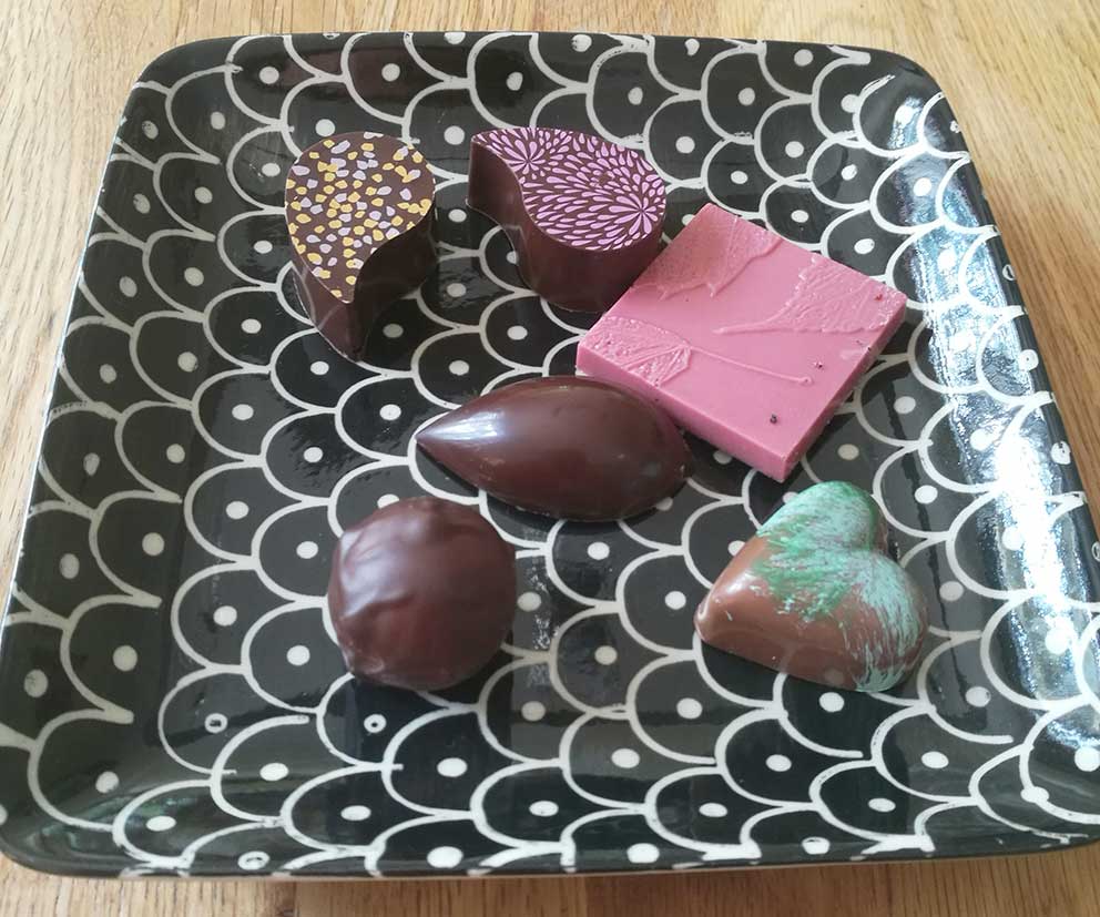 – Man kommer till en vägs ände och tänker att livet är för kort för att inte ha pröva något man har gått och funderat på. Jag anmälde mig helt enkelt till Noras chokladskola, som var tre dagskurser, förra året. Där fick jag lära mig att temperera choklad vilket betyder att man värmer chokladen till en viss grad beroende på om det är ljus eller mörk, men mellan 44 och 50 grader. Därefter ska man kyla ner chokladen till 26 - 28 grader. Lägger ut chokladen på marmorskiva och värmer chokladen igen, då får man fram chokladens glansiga yta. När man ”gör choklad hemma” smälter den direkt när man tar i biten, men det gör chokladen inte i och med det här sättet, berättar Eva.