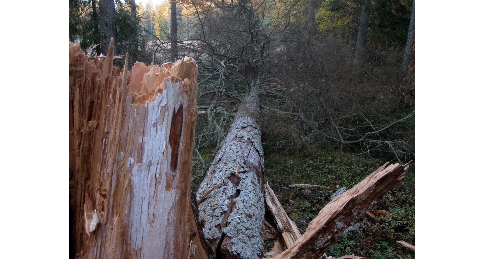 Vit skinnsvamp rötade den gamla granen som föll i dagarna.