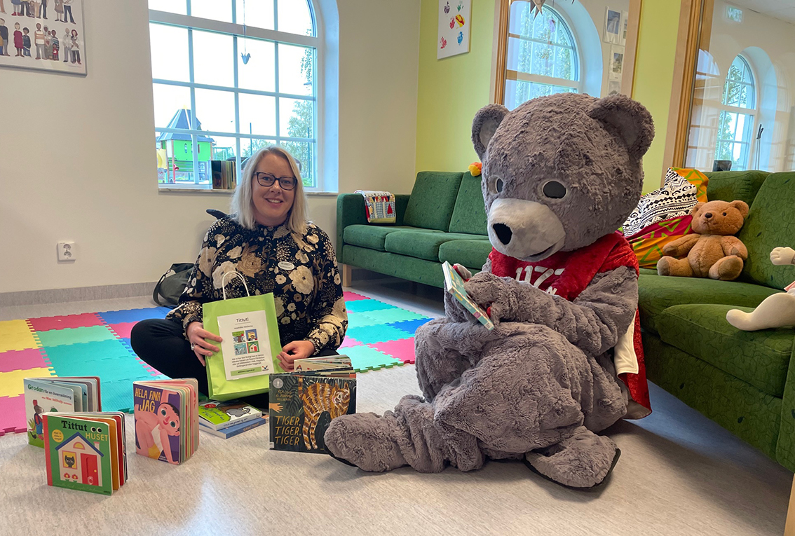 – Vi har olika teman och i dag har vi tema biblioteket och Maria Sandström Låstberg kommer hit och berättar om hur man kan läsa böcker för små barn. Man behöver ju inte vänta med att läsa böcker utan börja redan när de är små. Vi vill få barn att lära känna böckerna, små barn kan ju lära känna genom att ha dem i munnen och det gör ingenting. Skulle en bok gå sönder så är det inte hela världen, det är sådant som händer. Vi erbjuder bokpåsar med olika teman med fyra böcker i varje påse som man kan låna i från oss. De bokpåsar som ni har just nu vänder sig till barn mellan 0-3 år och de kan man hämta här och lämna här eller på biblioteket, fortsätter Helena.