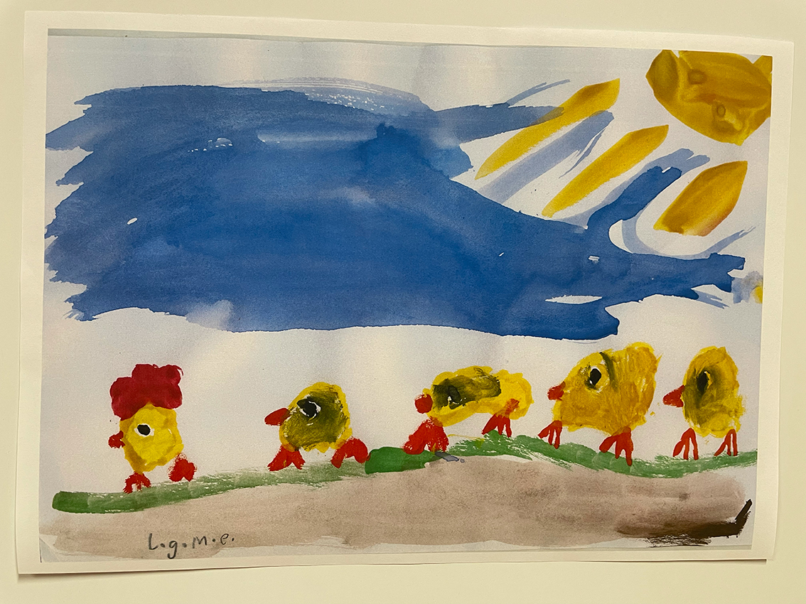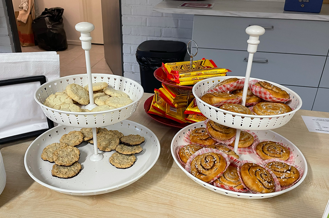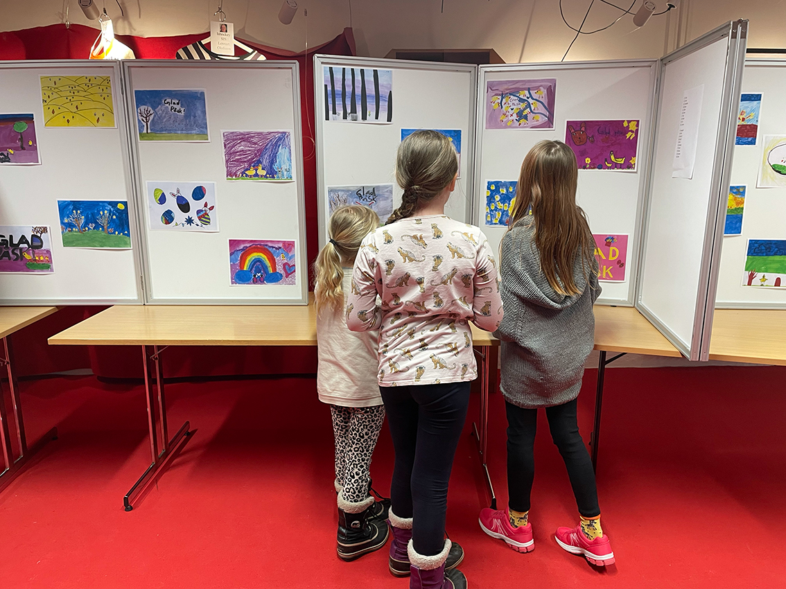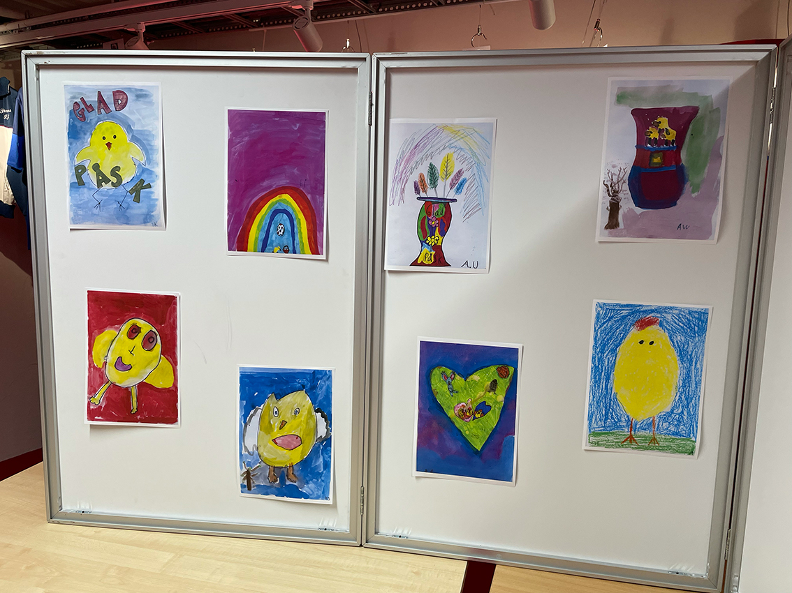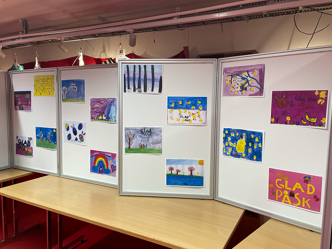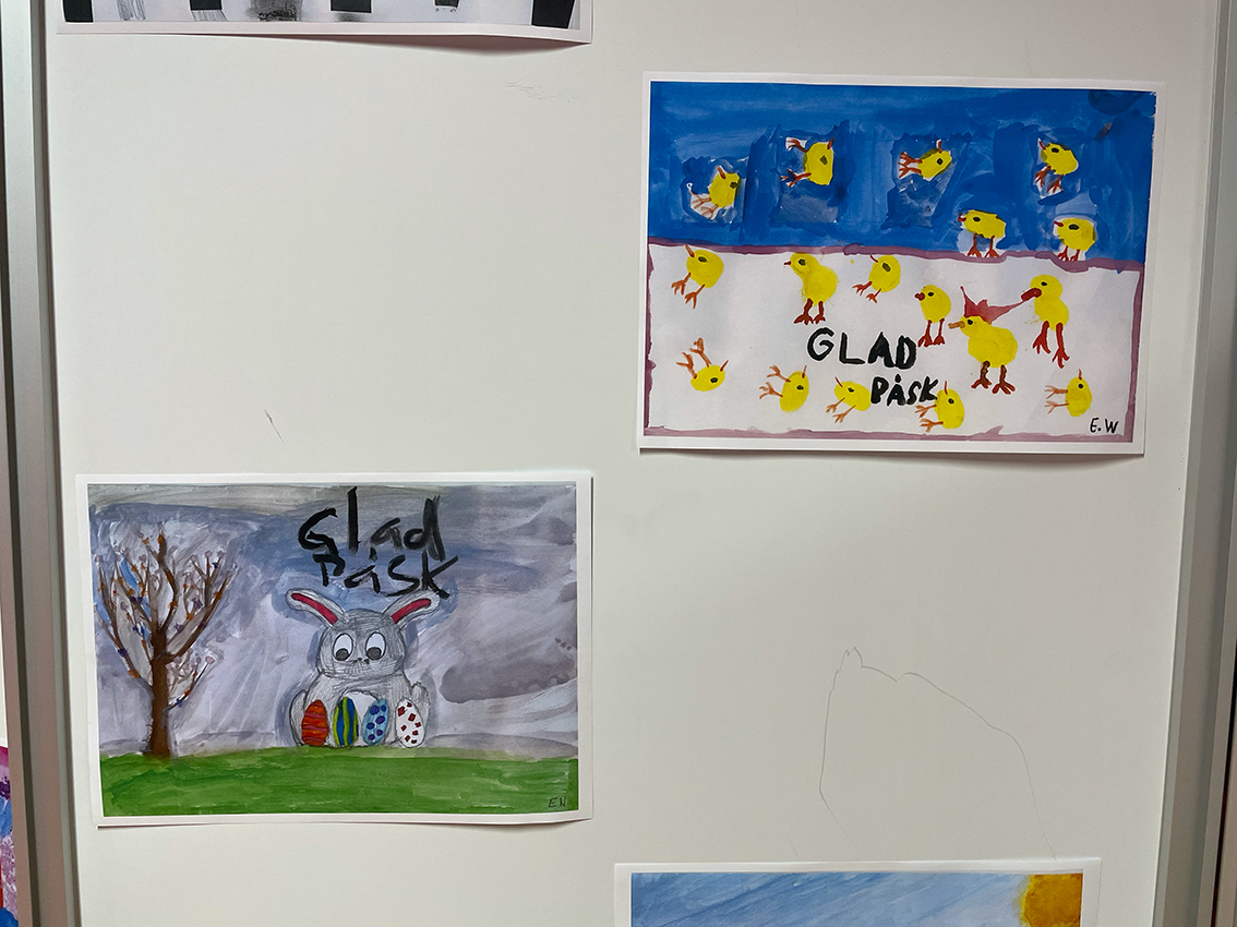 Påsktema var det på bilderna som var gjorda i många olika tekniker. Vattenfärg, kritor, färgpennor och collage, ja variationen var stor. Man blev verkligen glad av att se alla fina färgglada konstverk där kreativiteten varit stor. Kaffe och kakor stod framdukat så efter en titt på alla konstverk kunde man sätta sig ner och ta en fika.