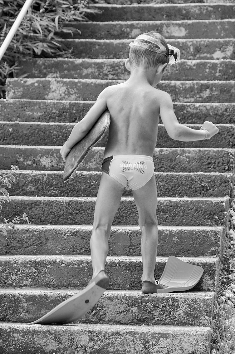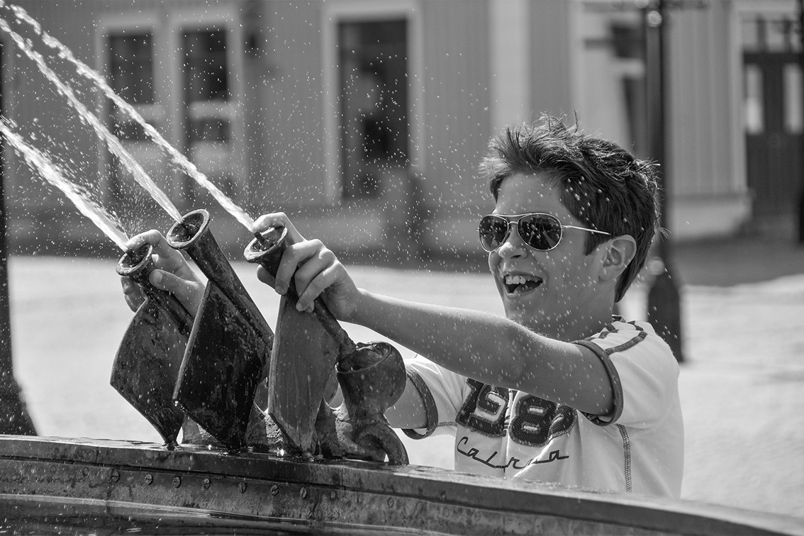 ”Här ser man verkligen glädjen hos pojken. Skulle vilja veta vad han sprutar vatten på men det lär bli en gåta. Fin komposition, fin gråskala.”