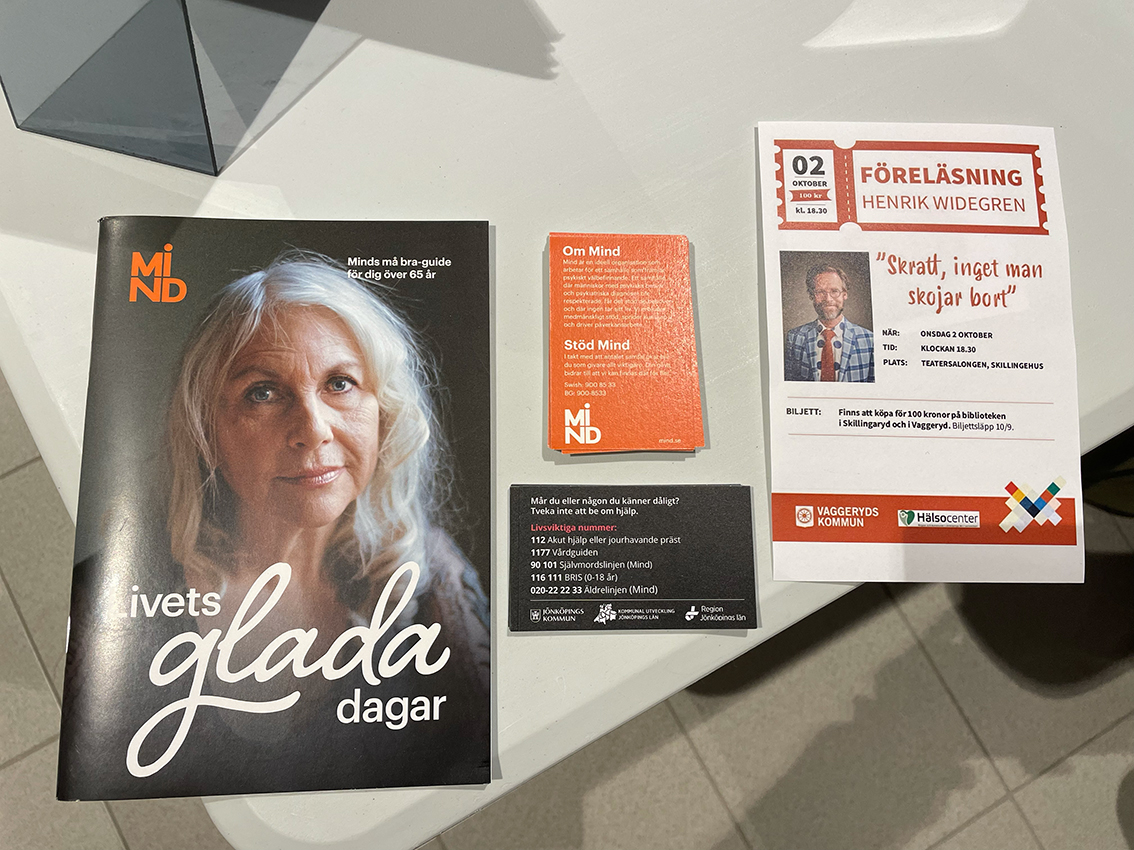 – Vi fokuserar här kring den psykiska hälsan med lite koppling till de gula bänkarna som vi har satt ut. Vi pratar om ”Livets glada dagar” så att man pratar lite om vad som kan vara positivt när man blir äldre också och inte bara det som kan vara negativt. Vi berättar också om att det finns jättemycket kontakter att få av flera organisationer som man kan ta kontakt med och få hjälp av, både i akuta lägen men även om man bara vill prata av sig, berättar Jerry.