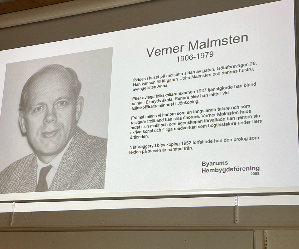 Verner Malmsten var lärare och föddes i Vaggeryd 1906 och gick bort 1979. Man minns honom som en fängslande talare med ”orden i sin makt”. Den egenskapen förvaltade han genom sin skrivarkonst och han medverkade flitigt som högtidstalare under flera årtionden. Det är alltså till hans minne som ett skrivarstipendium instiftades av Byarums hembygdsförening 1990 för utdelning till skolungdomar som skriftligen skildrar sin hembygd. En jury om fem personer med representanter från skolan och hembygdsföreningen utser den elev som har skrivit den bästa uppsatsen. Vinnaren får 2 000 kronor i stipendium och får även sin uppsats publicerad i Byarums hembygdsbok. Verner Malmsten har också fått en gata uppkallad efter sig i Vaggeryd och på den gatan ligger Fenix kunskapscentrum.