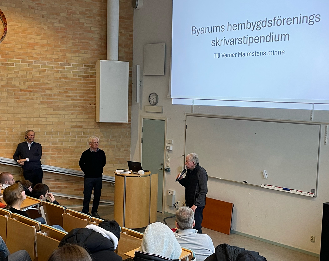 Under veckan samlades representanter från Byarums Hembygdsförening och berättade för gymnsieeleverna om ett skrivarstipendium till Verner Malmstens minne.