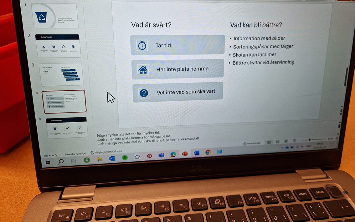 Vi tog oss till klassrummet på Fenix där uppgift nummer tre skulle presenteras, vilket var att analysera resultatet och identifiera vanliga problemområden. Huvuddelen av eleverna har fråga familjen, vänner och grannar om deras sorteringsvanor. Axel och Enok berättar: – Vi ser skillnaden på svar från äldre och yngre. Äldre är bättre på att sortera kan vi konstatera.