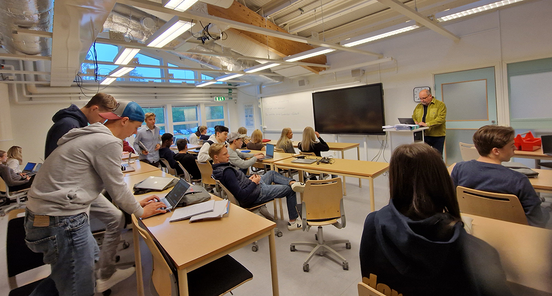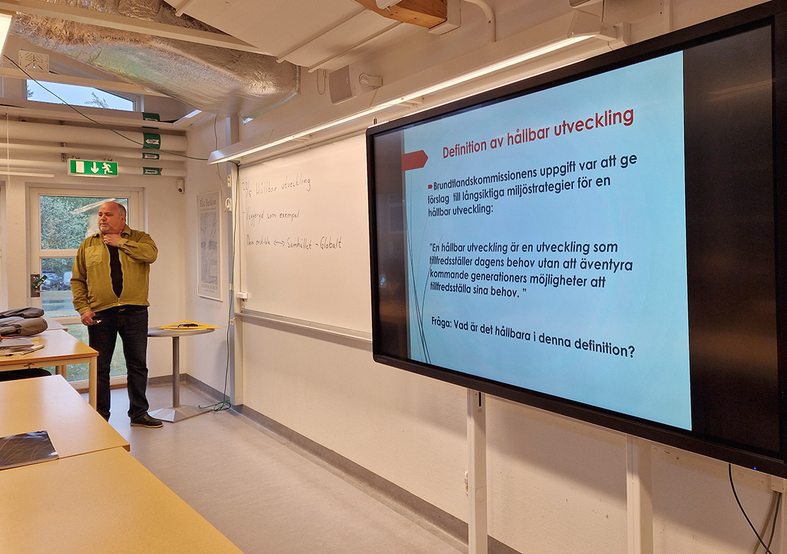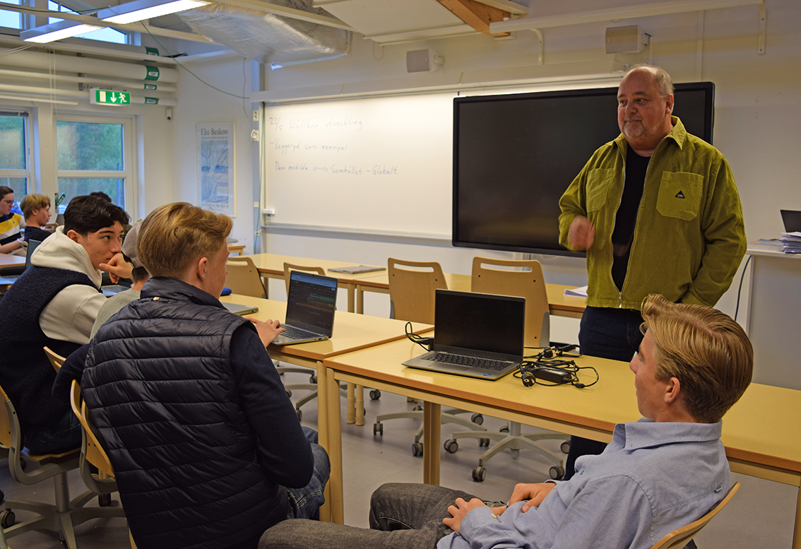 Temat är hållbar utveckling och läraren Magnus Malmström berättar att eleverna har undersökt bland grannar, vänner och familj hur deras avfall sorterats och vad man uppfattar som problem. Som stöd har eleverna använt sig av kommunens hemsida och på så vis lärt sig mer kring avfallssortering. Två lektioner i tre veckor har eleverna jobbat med återvinningsvanor.