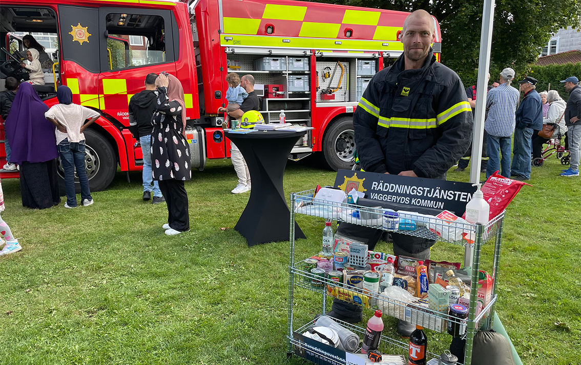 Vid stora brandbilen som räddningstjänsten visade upp flockades barn och andra intresserade. Barnen fick testa att sitta i brandbilen och runtomkring fanns brandmän som berättade om sitt arbete. Och om beredskap. Vad gör man om elen går, om vattnet slutar fungera, vad gör man vid situationer av kris? Samuel Willén på räddningstjänsten visar upp ett lager, ett förslag på vad man ska ha i sitt skafferi så att man är beredd om krisen kommer.