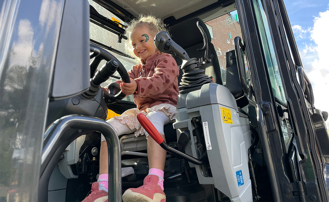 Temat för dagen var ”Rörelse med inriktning till barn, ungdomar och äldre” och det var många som var ute och rörde på sig den här dagen. Vid grävmaskinen träffar vi Marlene Lindström som jobbar som målare på Vsbo. Hon hjälpte barn att komma upp i den höga maskinen. En populär aktivitet för dagen.