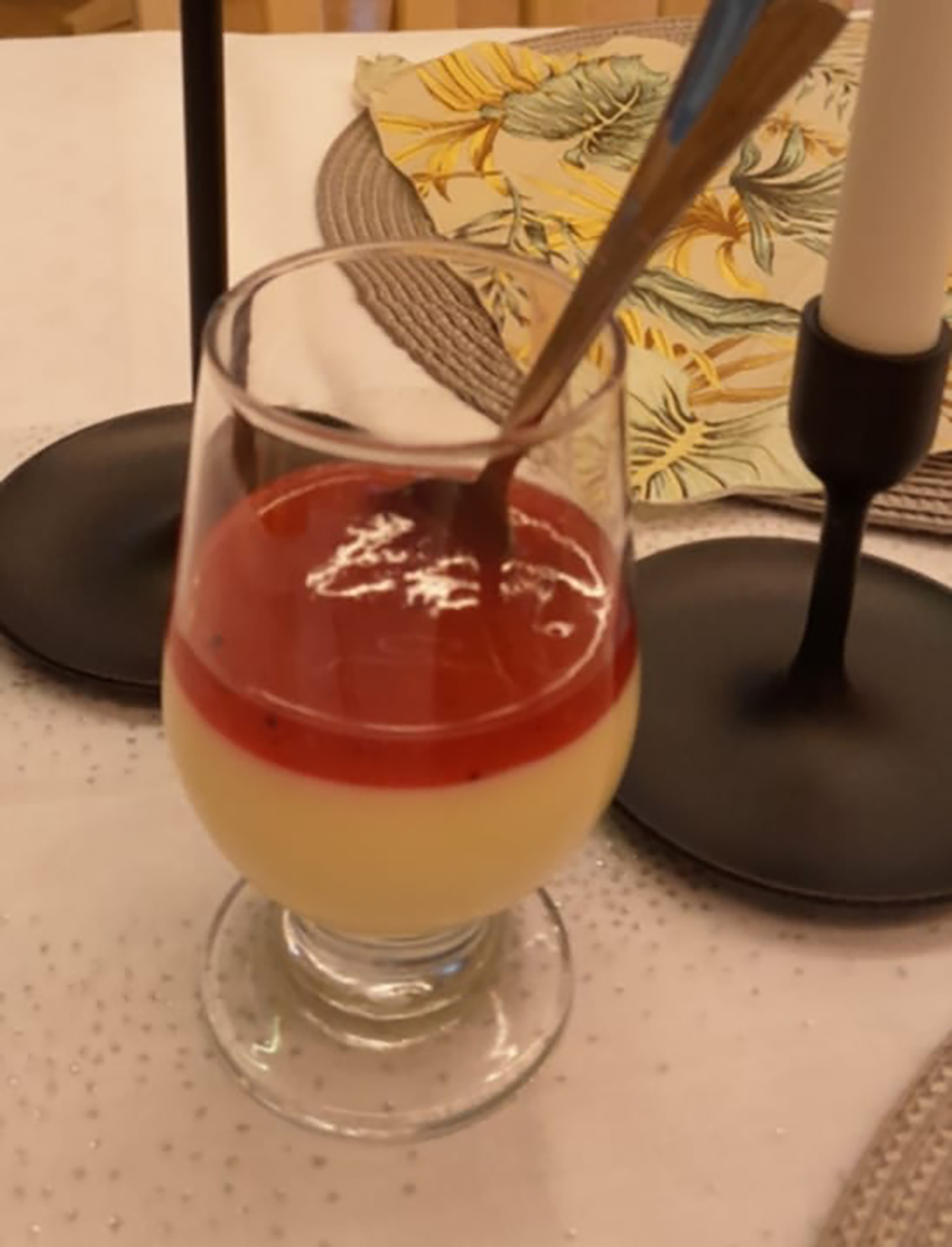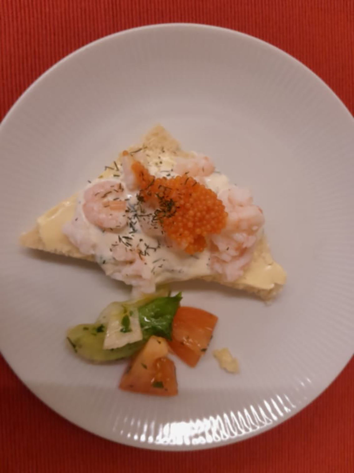 Till förrätt stod det skaldjurssnittar på menyn, till varmrätt serverades nötstek med potatisgratäng och rödvinssås och desserten bestod av vaniljpannacotta med bärsås. Mums, vilket käk!