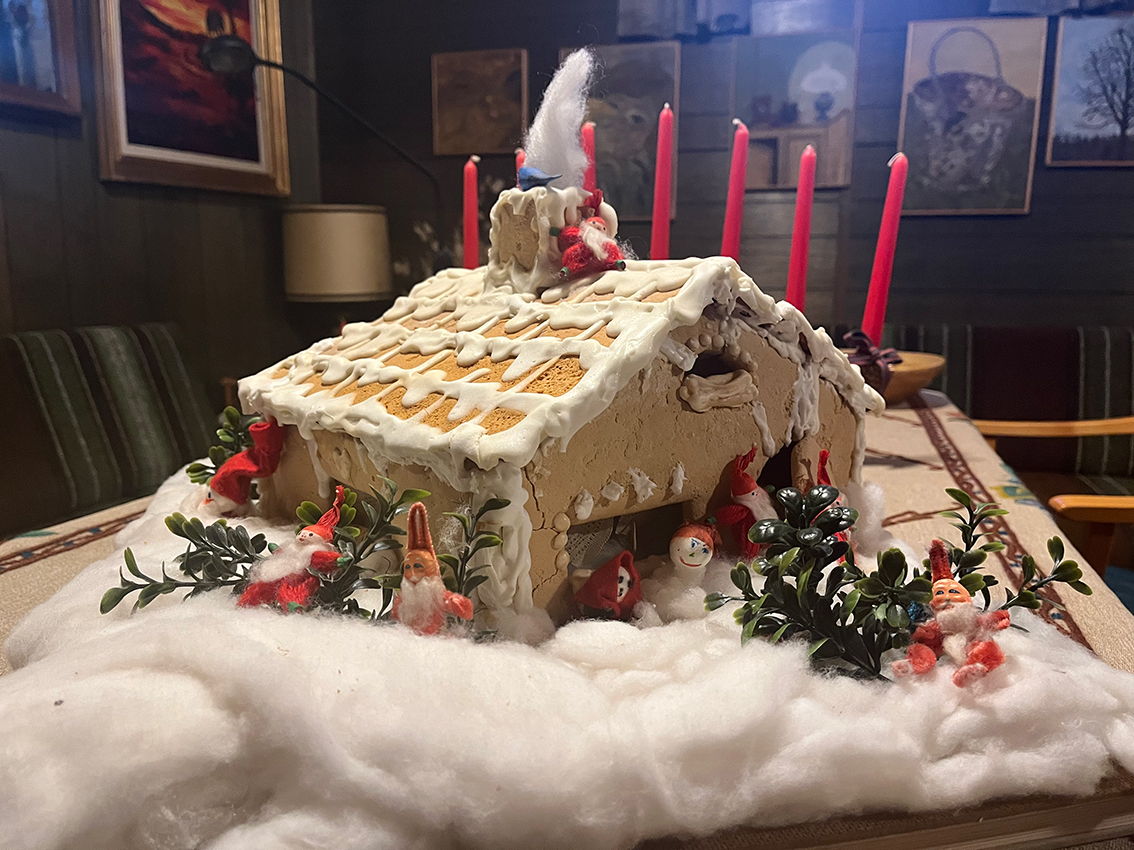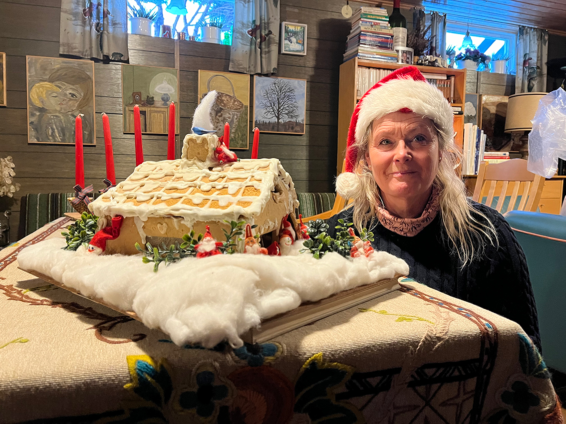 I huset på Östermo i Vaggeryd syns det verkligen tydligt att julen är här. Här finns tomtar och julprydnader i varenda hörn. – Det är traditioner, säger Christina Olofsson. Det är Christina som har bakat det 56 år gamla pepparkakshuset som är helt och bevarat men har bleknat något i färgen. Huset bakades när äldsta dottern Petra var bebis. I källaren står det gamla pepparkakshuset och jag kan inte låta bli att förundras över att det har hållit i så många år. Helt otroligt faktiskt.