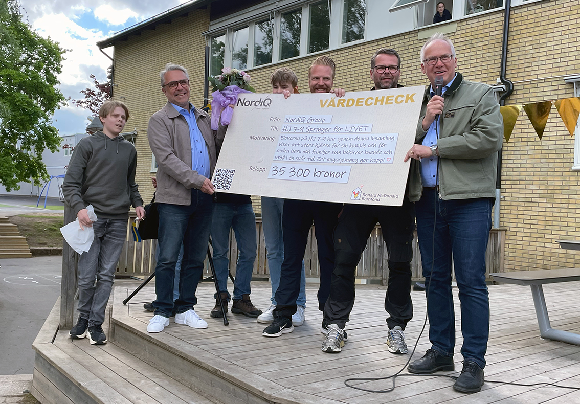 – Först och främst, tack till alla elever, det är ni som har gjort jobbet. Vi har under våra idrottslektioner sprungit och i år sprang vi ”för livet”. Alla föräldrar, och andra som har velat, har fått chansen att skänka och i år ville vi donera pengarna till Ronald Mcdonald i Linköping för vi vet att deras arbete är superviktigt för familjen Adelöw som är där just nu.