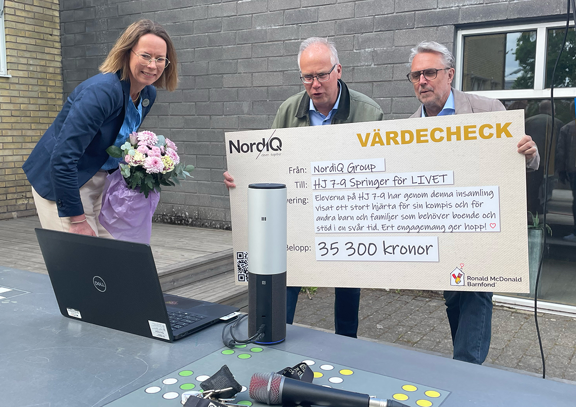 Stefan Ottosson och Mikael Samuelsson från Nordiq Group klev upp på scenen med en jättestor värdecheck.