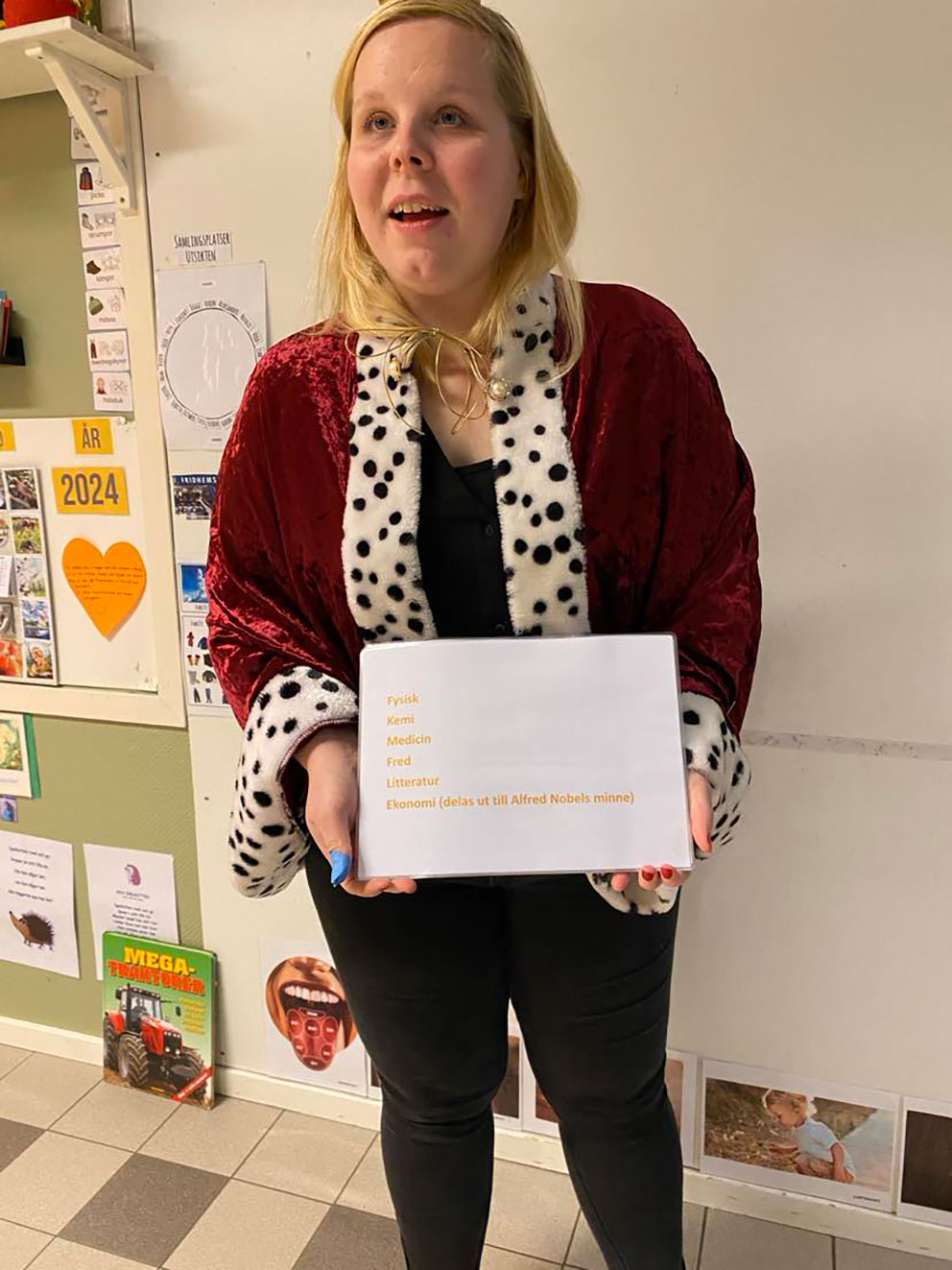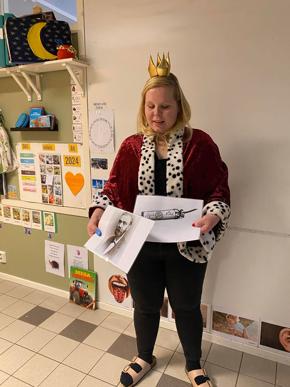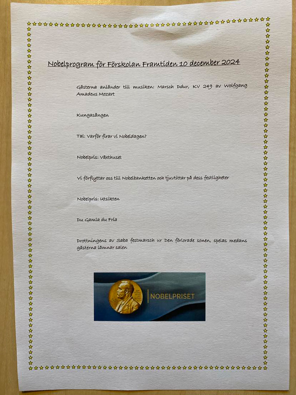 – Vi började med att barnen fick ett program och lyssna på musiken Marsch Ddur av Wolfgang. Sedan lyssnade vi på "Kungasången" och då kom Kungen in och berättade varför vi firar Nobeldagen. Barnen på förskolan Framtiden fick veta att Alfred Nobel var Sveriges kändaste vetenskapsman, han uppfann dynamiten som skulle spränga bort berg men han ville inte att dynamiten skulle användas i krig.