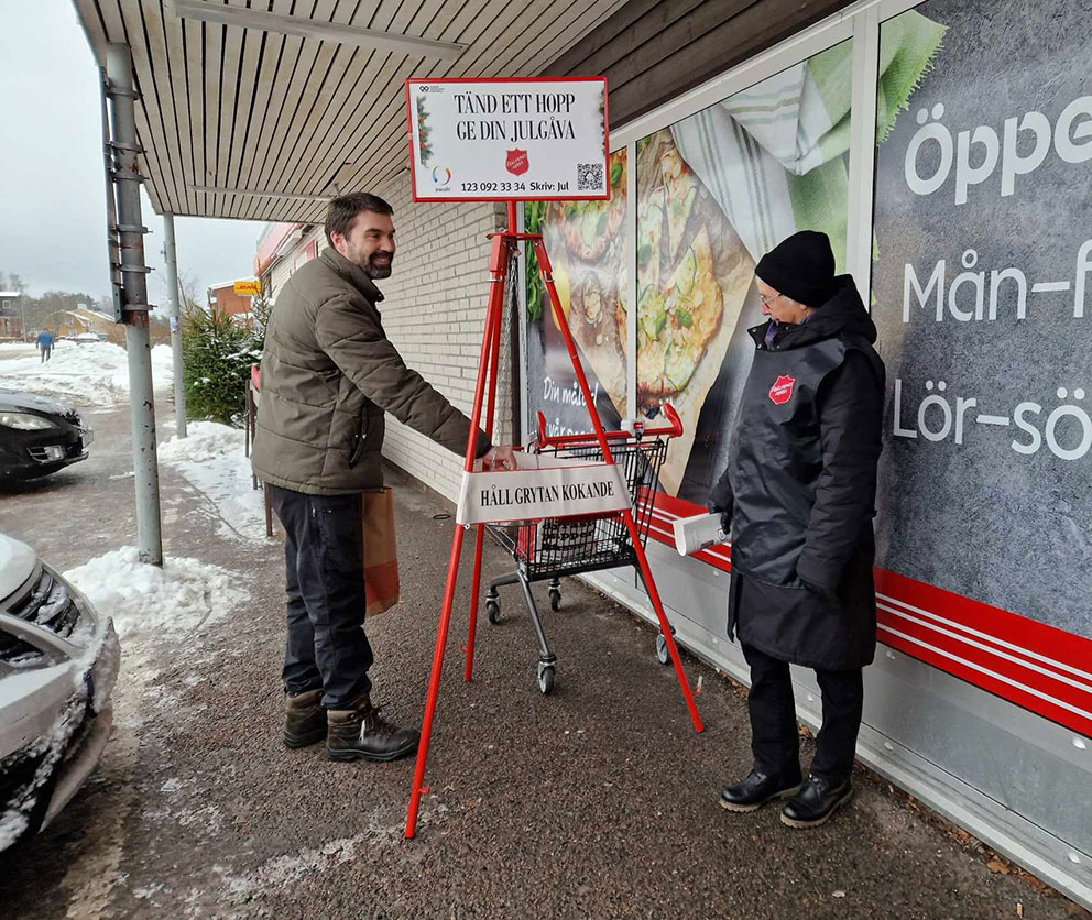 – Pengarna som skänks går till hjälpbehövande i Skillingaryd med omnejd. Vi är ett tiotal, knappt, från Frälsningsarmén som hjälps åt att finnas på plats utanför matbutikerna nu innan jul. Första grytan gjordes i början av 1900-talet i Amerika. När Frälsningsarmén kom till Sverige fortsatte vi och det är en tradition att hålla grytan kokande, berättar Kerstin Svensson.
