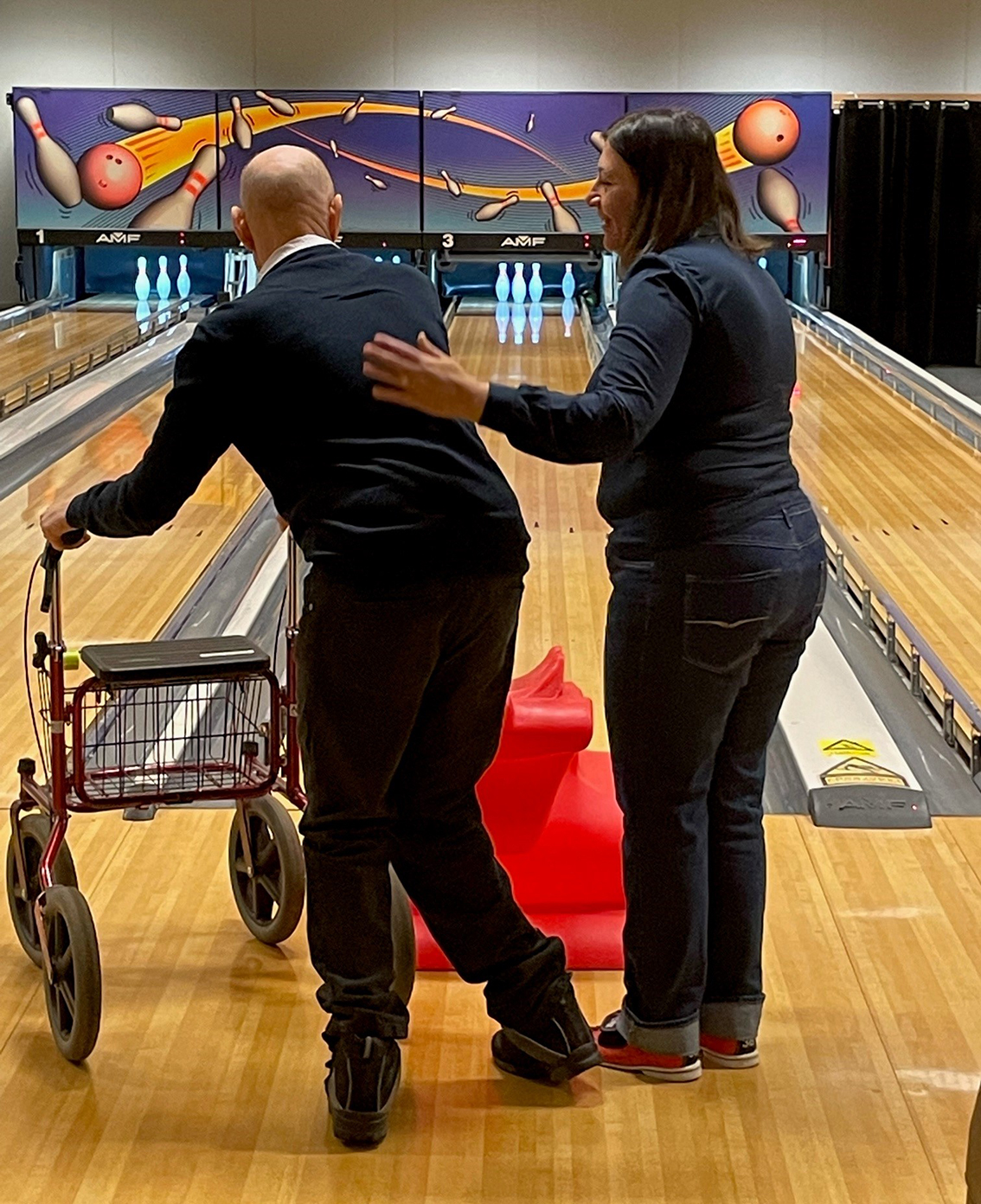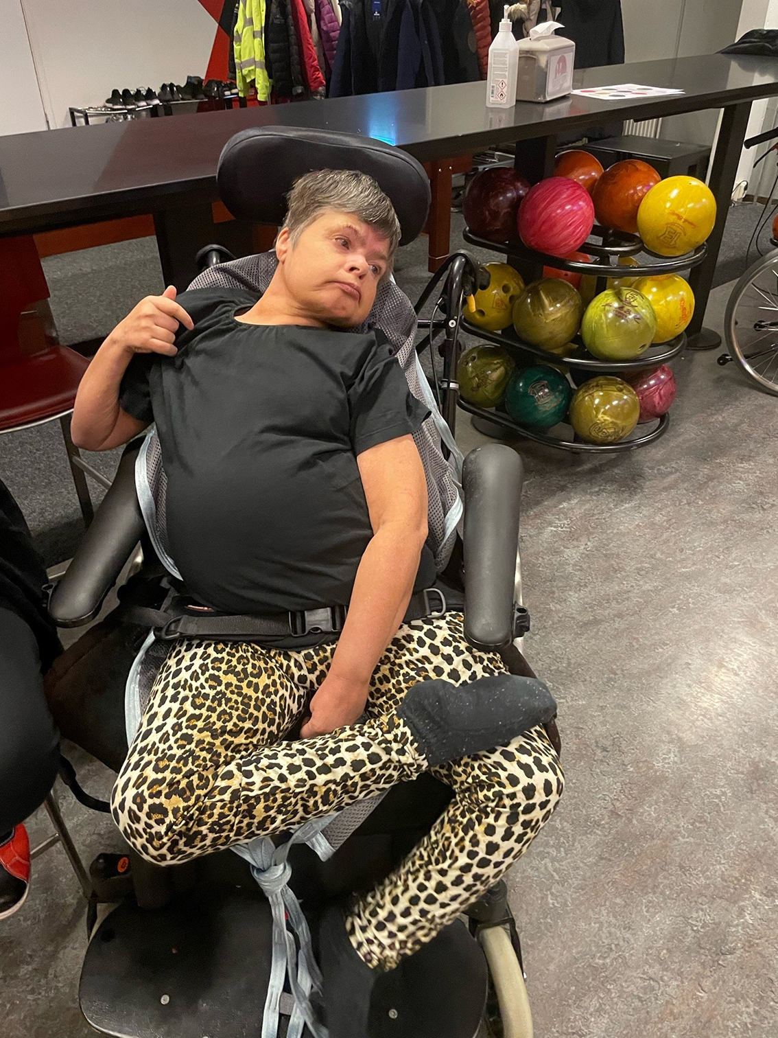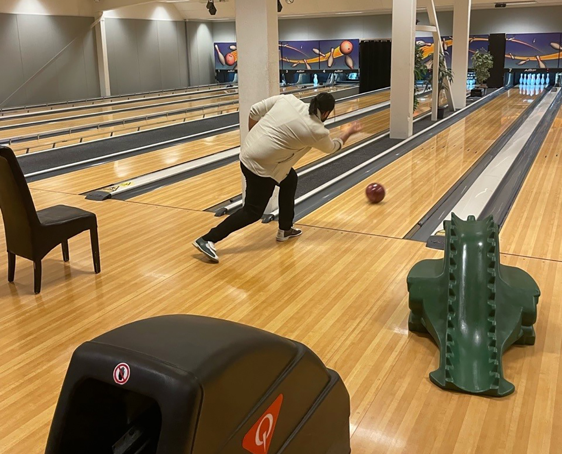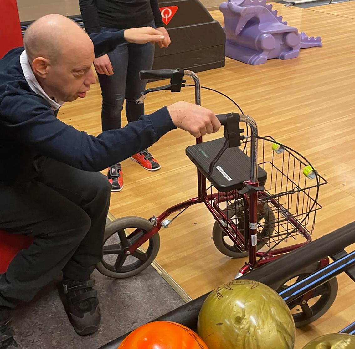 Nu var det dags igen att försöka få kloten att slå ner så många käglor som möjligt. Ibland rullade kloten på bra och många käglor åkte ner men ibland ville de bara inte gå rätt väg. Stämningen var det däremot inget fel på och det bjöds på många glada skratt. Alla som ville kunde delta eftersom banorna var anpassade för rullstolsburna.