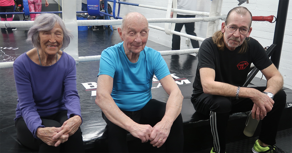 ”Vad är du arg på?” ropar en av deltagarna för att peppa sin kamrat som slår mot boxingssäcken, och genast blir frekvensen lite högre i slagen. Att äldre skulle träna lättare för att medelåldern stämmer inte alls. Träningen är i stort sett likadan som för yngre målgrupper, men aningen anpassad efter förmåga och styrka. Deltagarna boxas, hoppar och lyfter vikter.