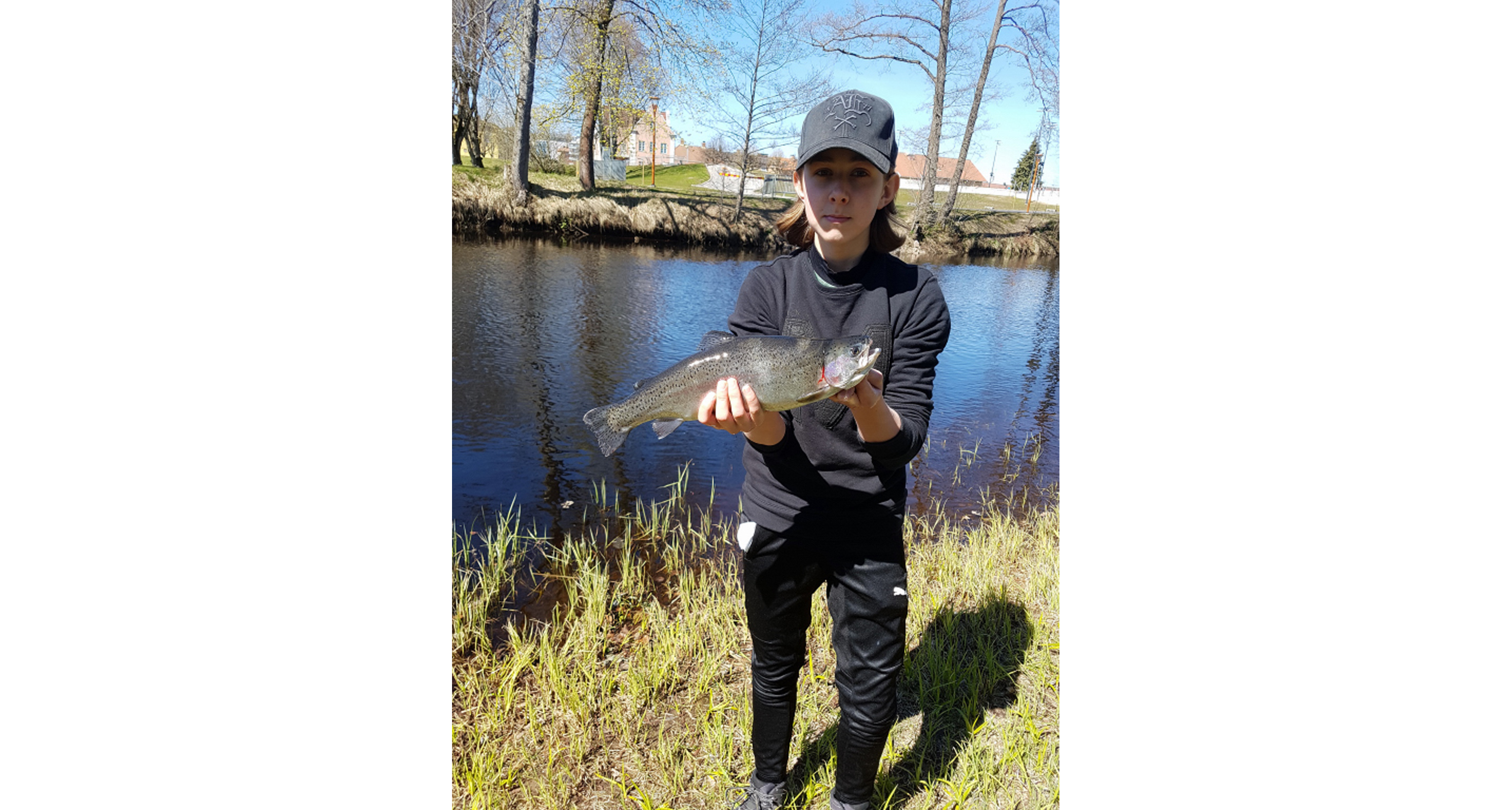 Oscar Lindman, Värnamo, har fångat en stor regnbåge i Lagan vid Arken i Värnamo, foto Oscar Nivemark, Värnamo.
