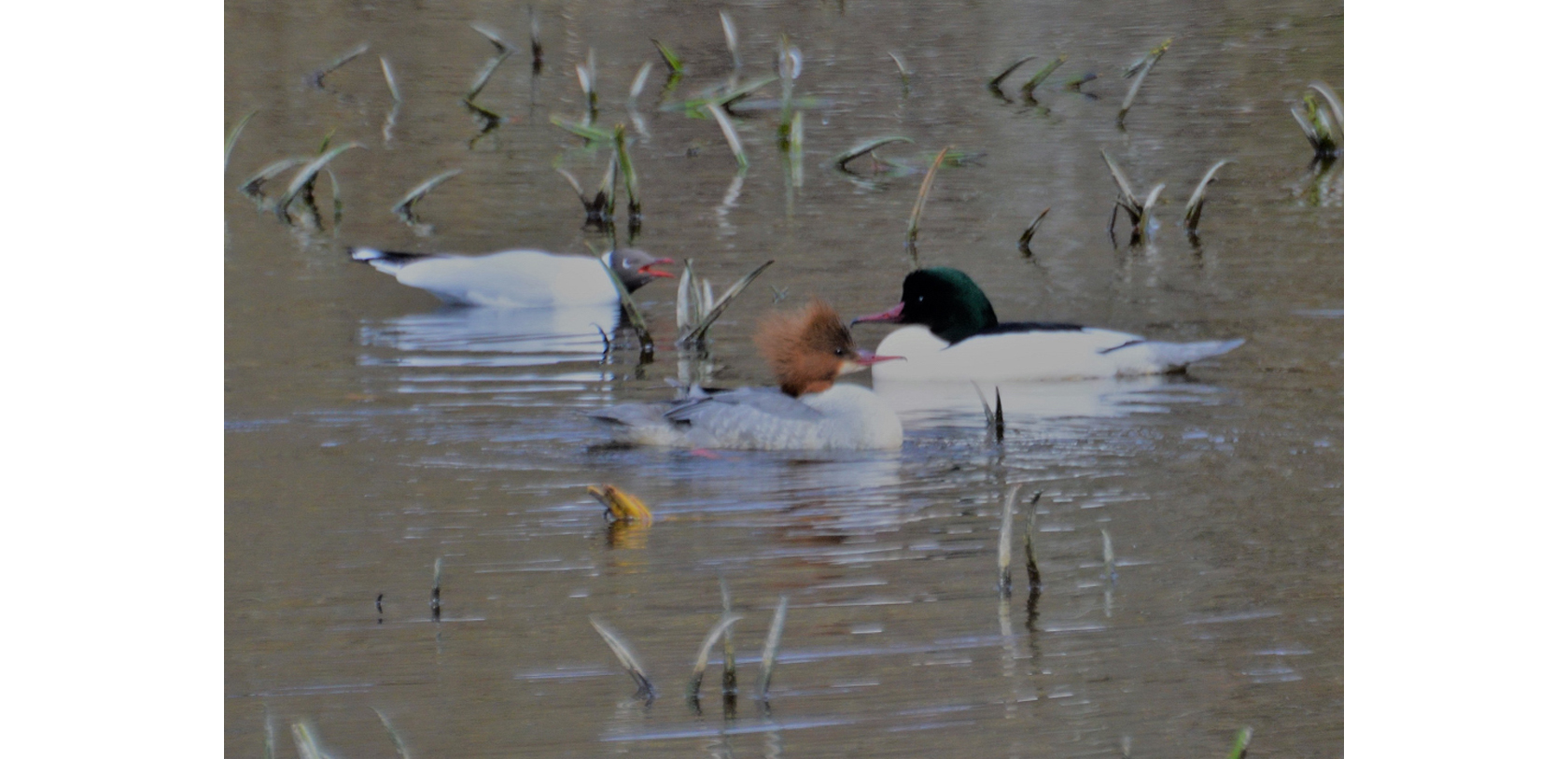 Ett storskrakepar, ”Mergus merganser”, och en irriterad skrattmås, ”Chroicocephalus ridibundus”, foto Kjell Holmqvist, Huskvarna.