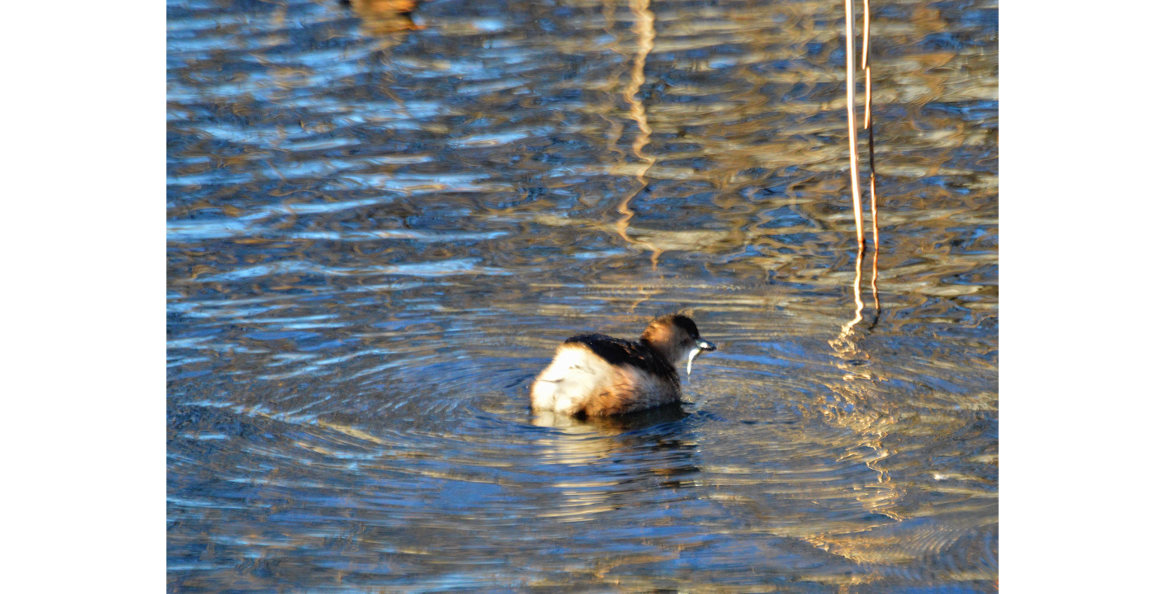 Smådopping, ”Tachybaptus ruficollis”, med en liten fisk i näbben, kanske en spigg i familjen ”Gasterosteidae”, och då kanske en småspigg, ”Pungitius pungitius”, foto Kjell Holmqvist, Huskvarna.