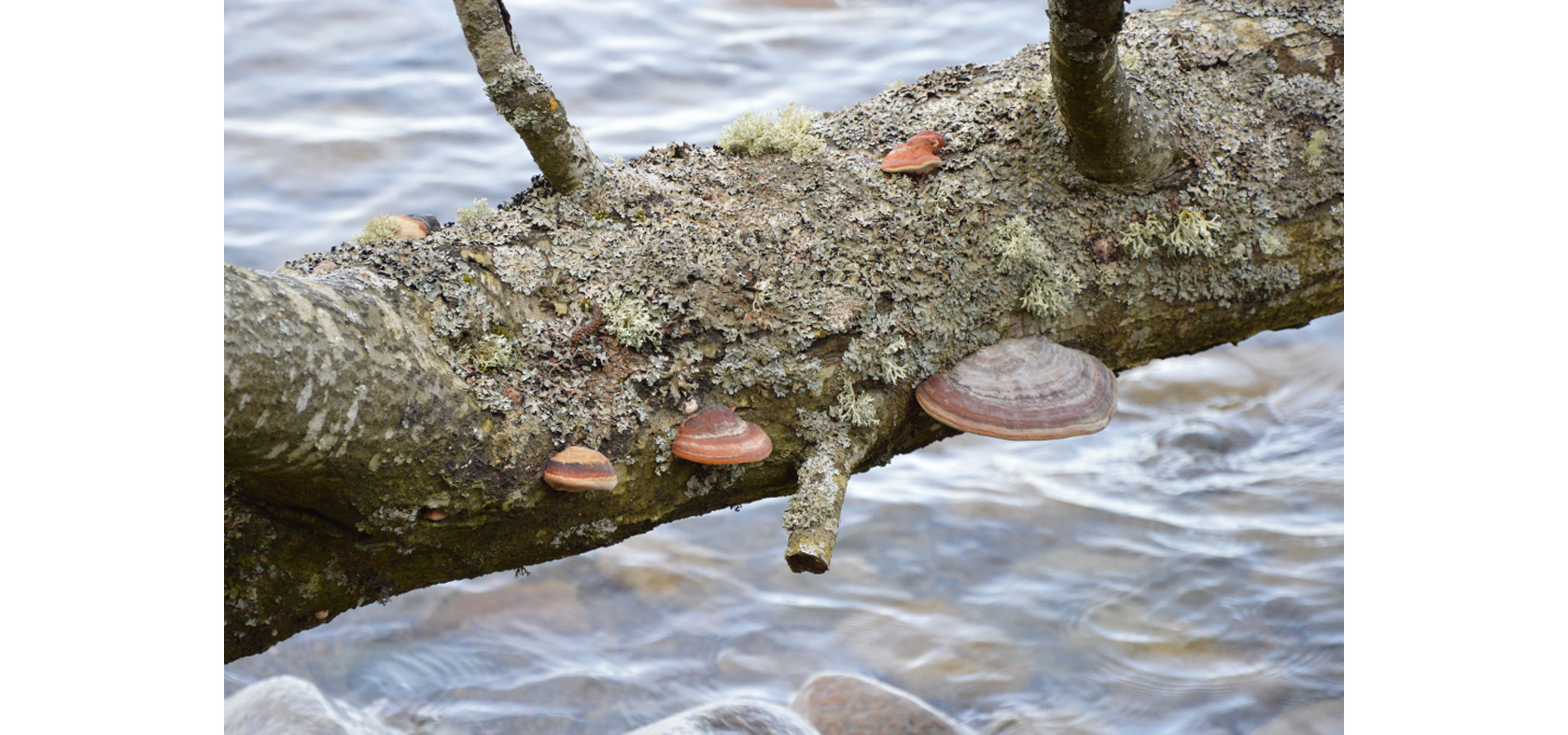 Klibbtickor, ”Fomitopsis pinicola”, slånlav, ”Evernia prunastri”, och skrynkellav, ”Parmelia sulcata”, med mera på en fallen aspstam, ”Populus tremula”, foto Kjell Holmqvist, Huskvarna.