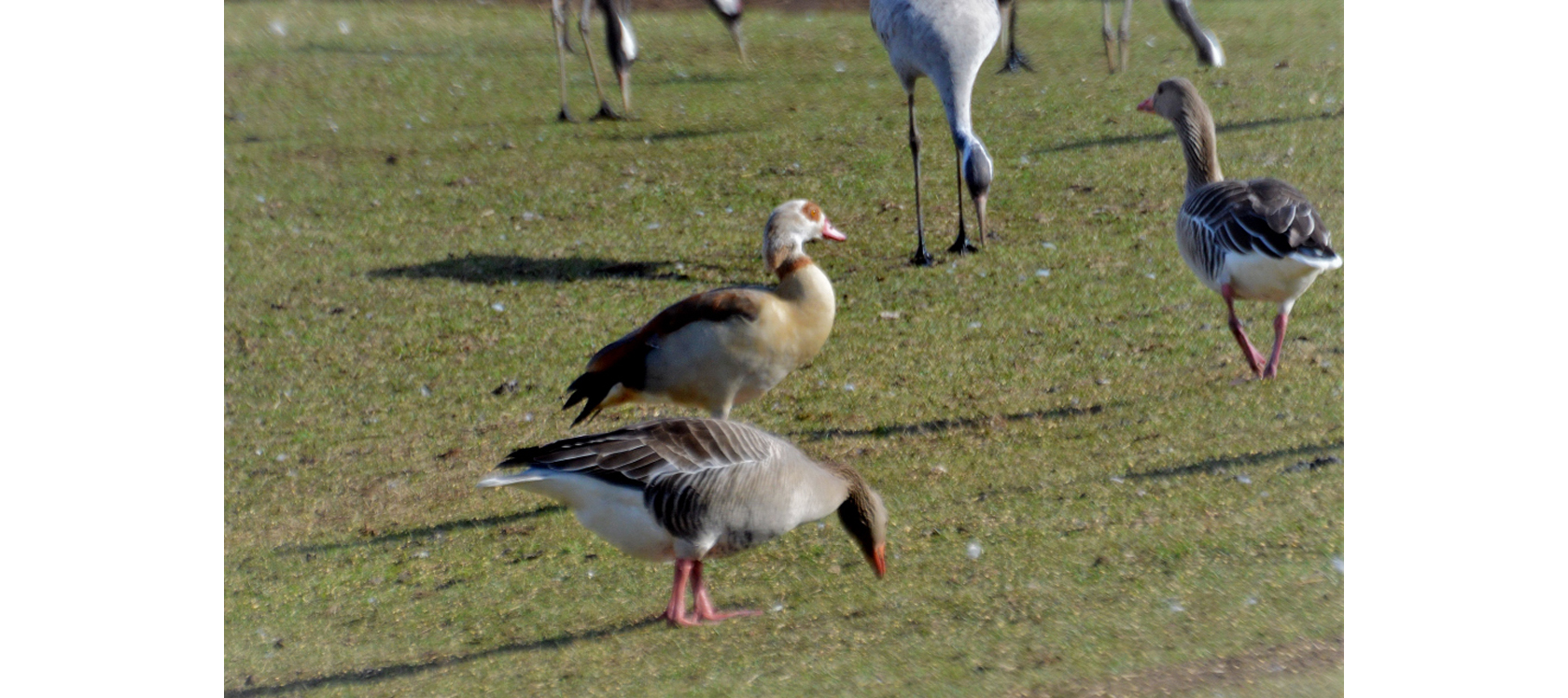 Ett allt vanligare besök i Sverige är av bildens nilgås, ”Alopochen aegyptiaca”, som här går bland grågäss, ”Anser anser”, och tranor, ”Grus grus”, vid Hornborgasjön i Västergötland, foto Kjell Holmqvist, Huskvarna.