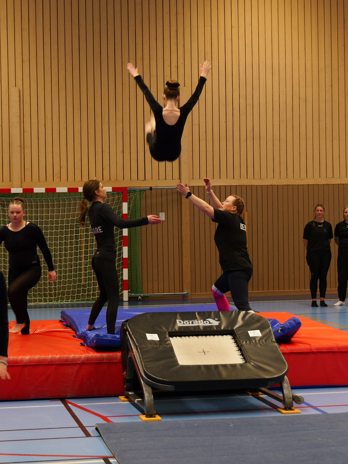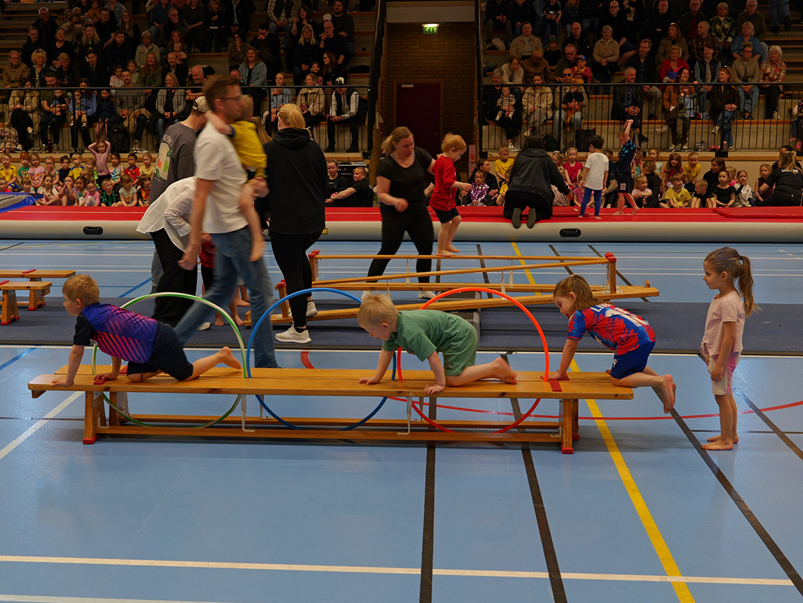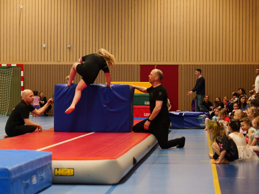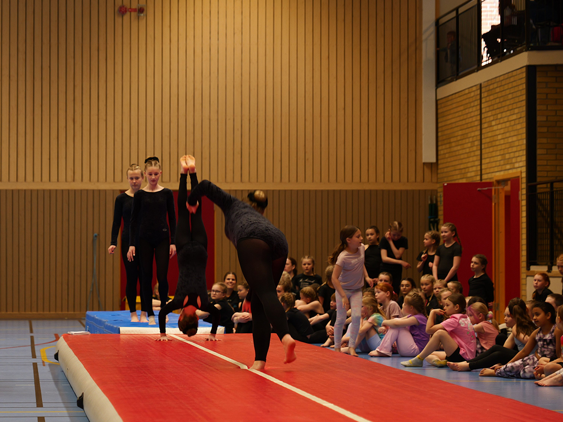 Uppvisningen var uppdelad i två etapper där första etappen bestod av cirka 90 barn från barngymnastiken och cirka 18 unga från parkouren. Efter en paus och omorganisering av redskap var det dags för våra cirka 105 truppgymnaster att visa vad de lärt sig under året.