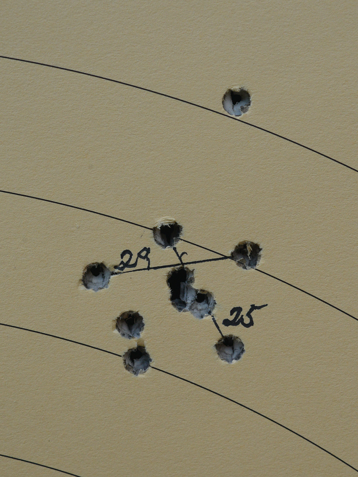 – Jag tycker att det är bra att man också kan få minuspoäng för en dålig träff. Det är mycket bättre att avstå från ett dåligt skott än att skadskjuta. Bilden på träffområdet på zebran är typisk. Vi sköt liggande och avståndet var 300 meter. Som synes är fullpoängaren på 30 poäng bara nio centimeter men vad värre är att om man felbedömer avståndet några meter och hamnar lite lägre, då är man i frambenet och får istället minus 30 poäng. Som försiktig skytt siktade jag högre, i 25-poängaren.