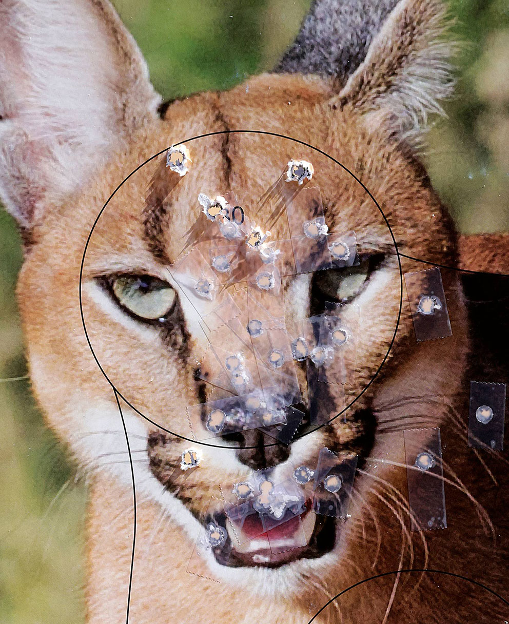 – Lodjuret på bilden är ett typiskt mål. Mina fem skott blev fyra 30-poängare högt i panna och en 25-poängare genom överläppen och in i halsen. De övriga kulhålen är övertejpade efter att tidigare skjutlag skjutit dem.