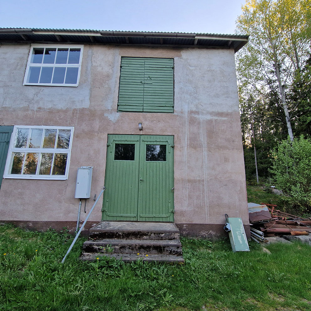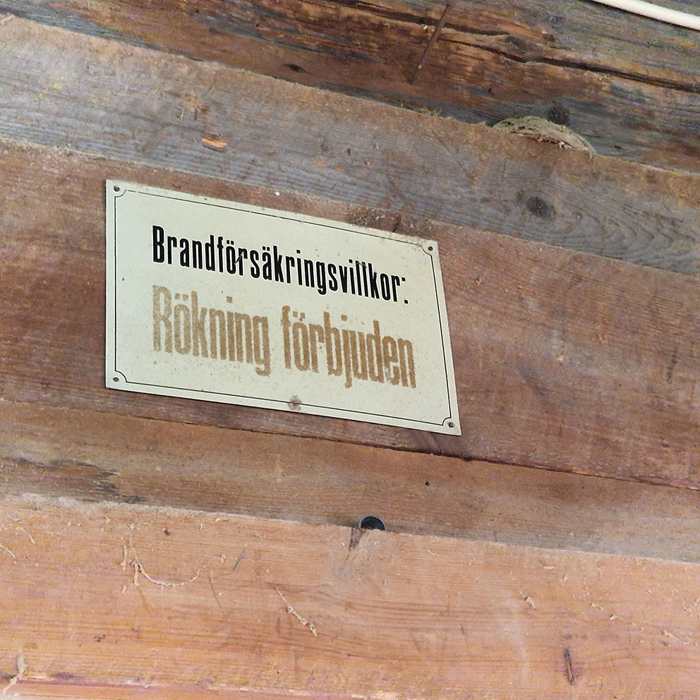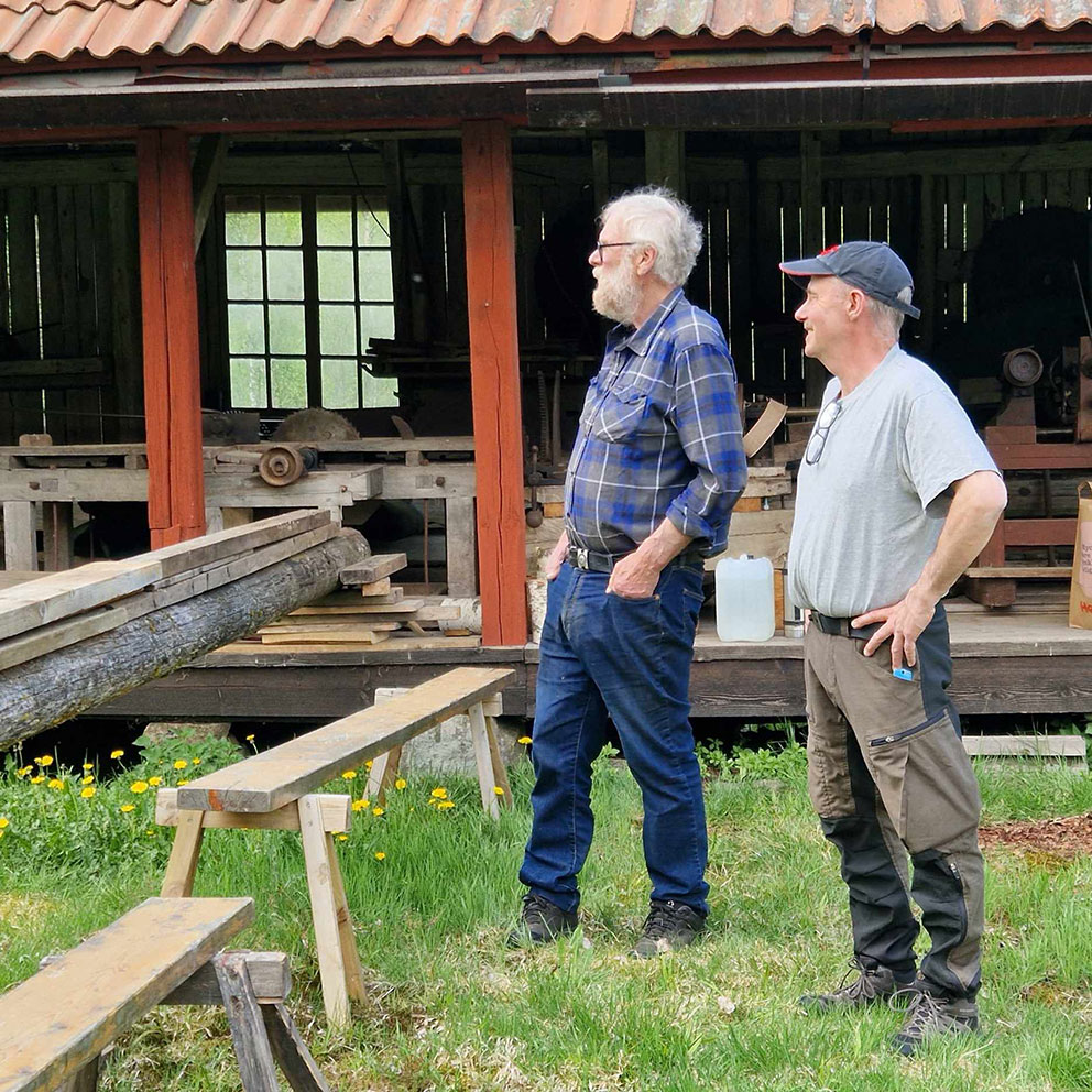 Från sågen finns ett större rör uppbyggt. Håkan berättar ”Det är en spånfläkt. Tidigare hamnade spånen i Horsån och följde med ner till Vaggeryd”.