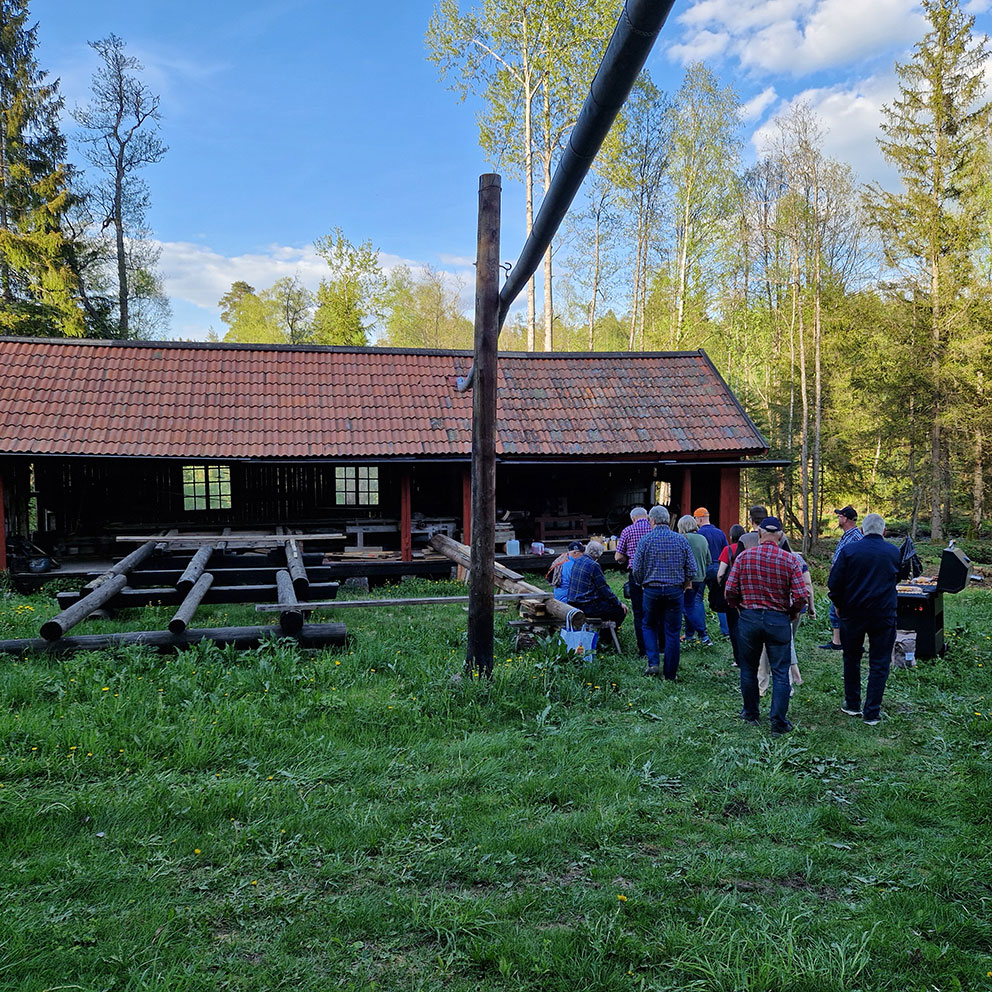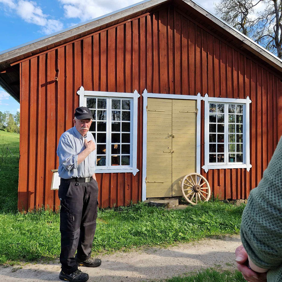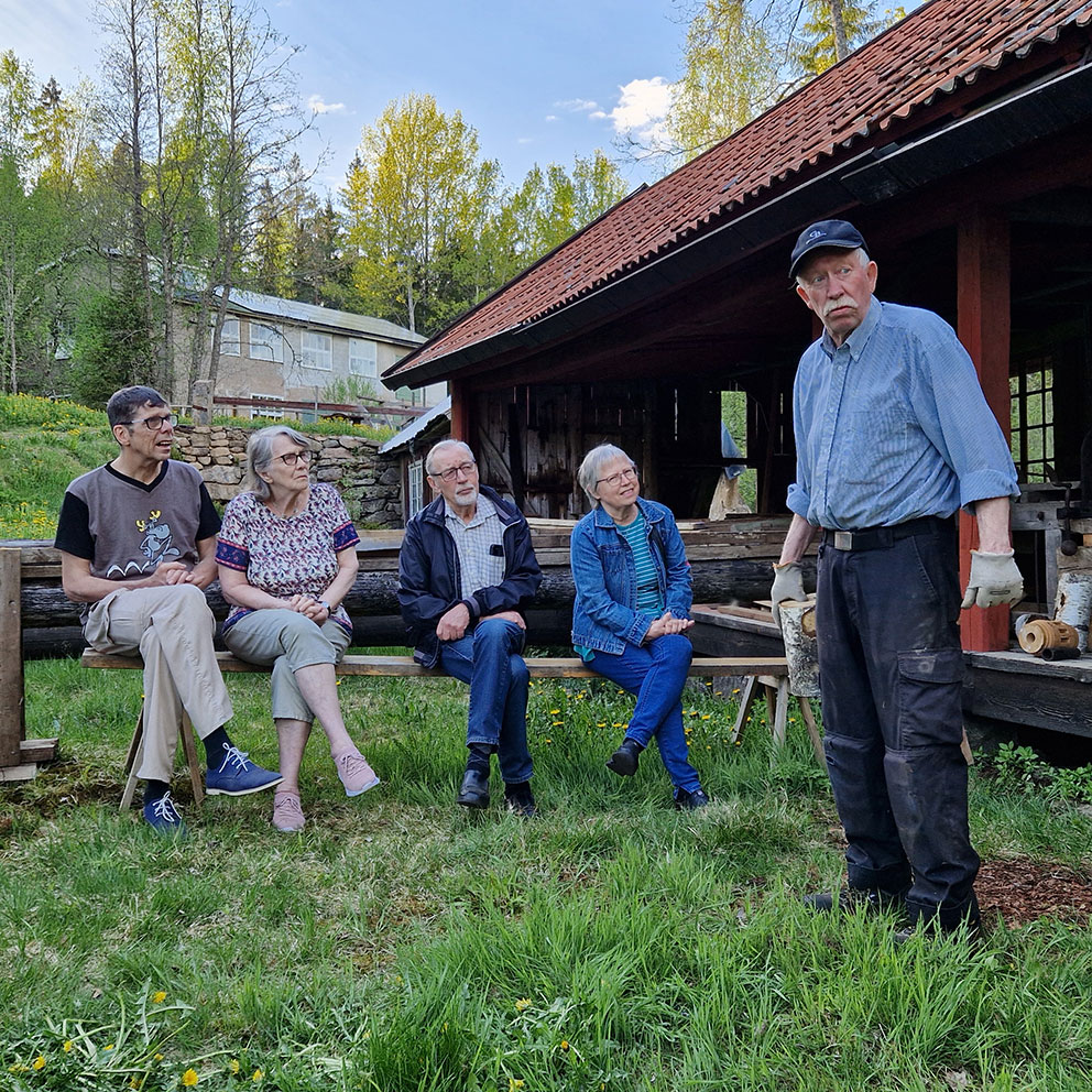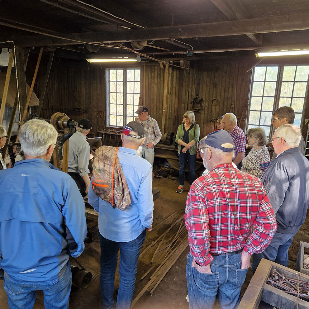 Sällskapet började vid Kvarnabergs hjulverkstad där verksamheten startarde 1880. Håkan berättar: – Hjulverkstaden är en av tre byggnadsminne i kommunen. Ett byggnadsminne utfärdas av Länsstyrelsen och får inte rivas. Här gjordes vagnshjul. De är gjorda av två trädslag, björk och antingen ask eller ek. Maskinerna inne i verkstaden är från 1800-talet och senast det var verksamhet här var 1965. Intill här rinner Horsån som börjar i Braskabo, rinner ut i fyra sjöar och ett antal gölar på vägen ner till Munksjö. Horsån ansluter sig därefter till Lagan.