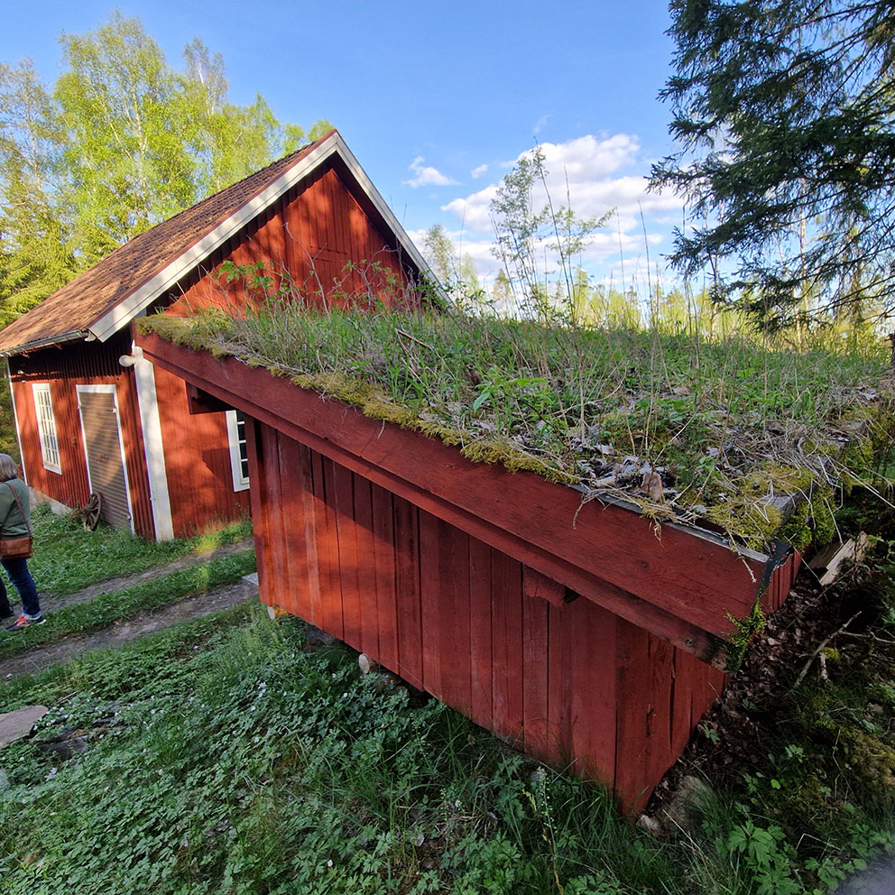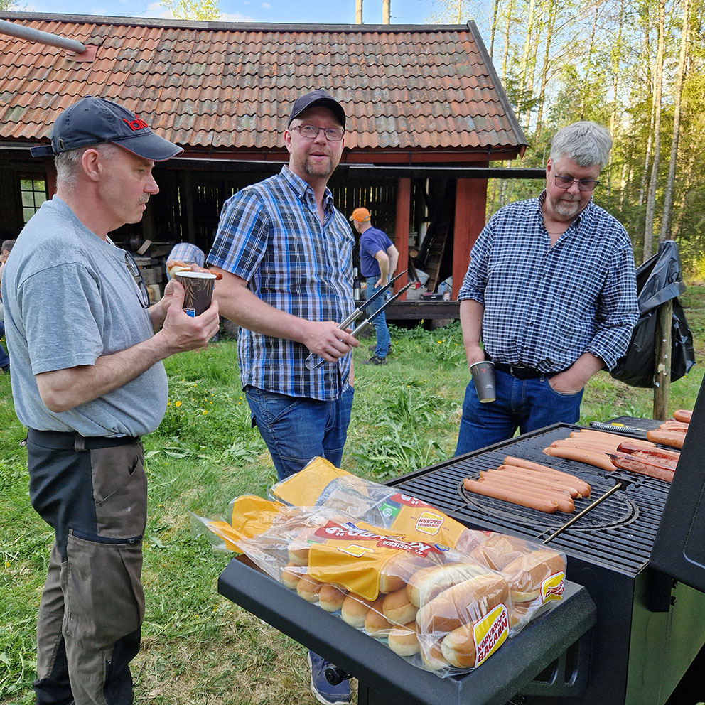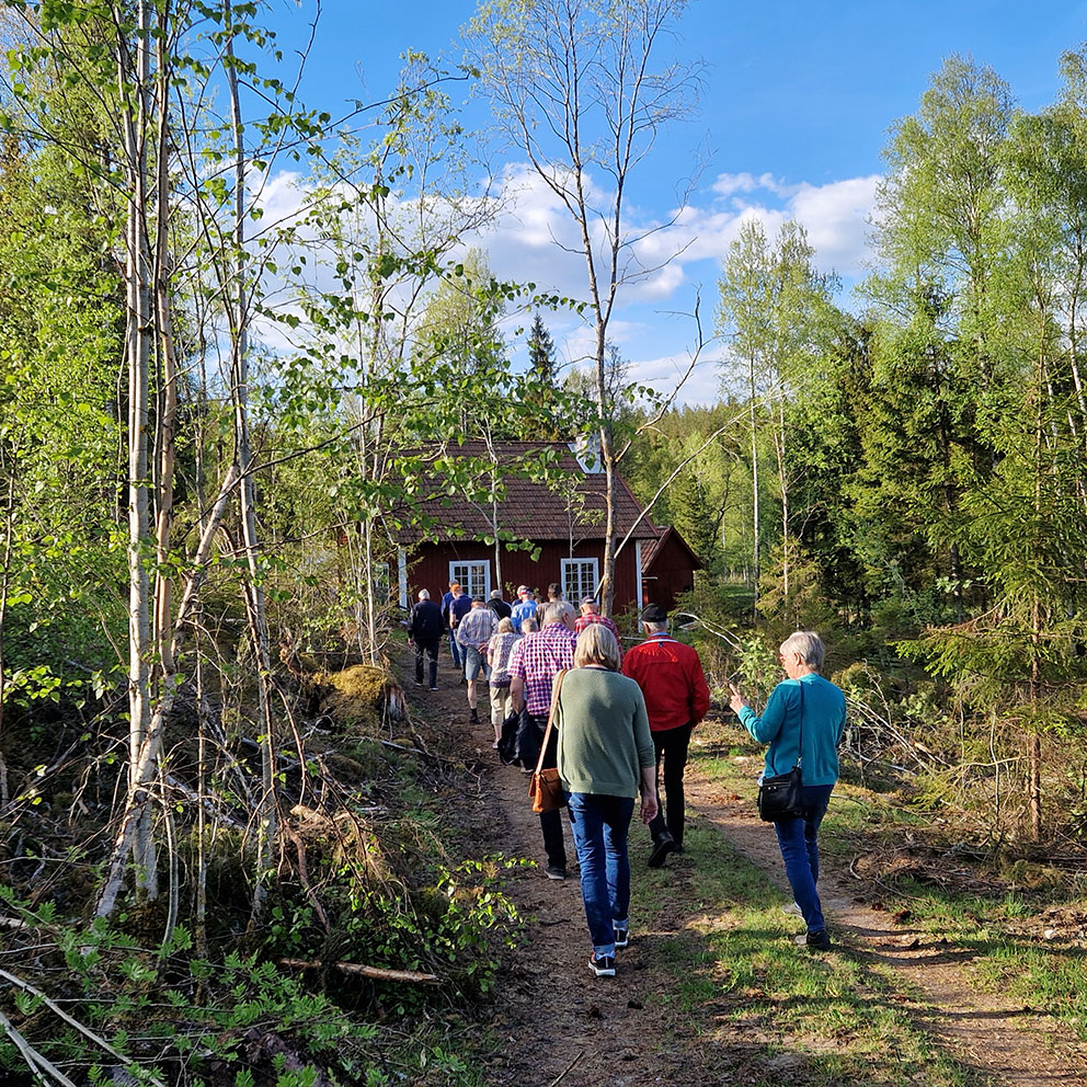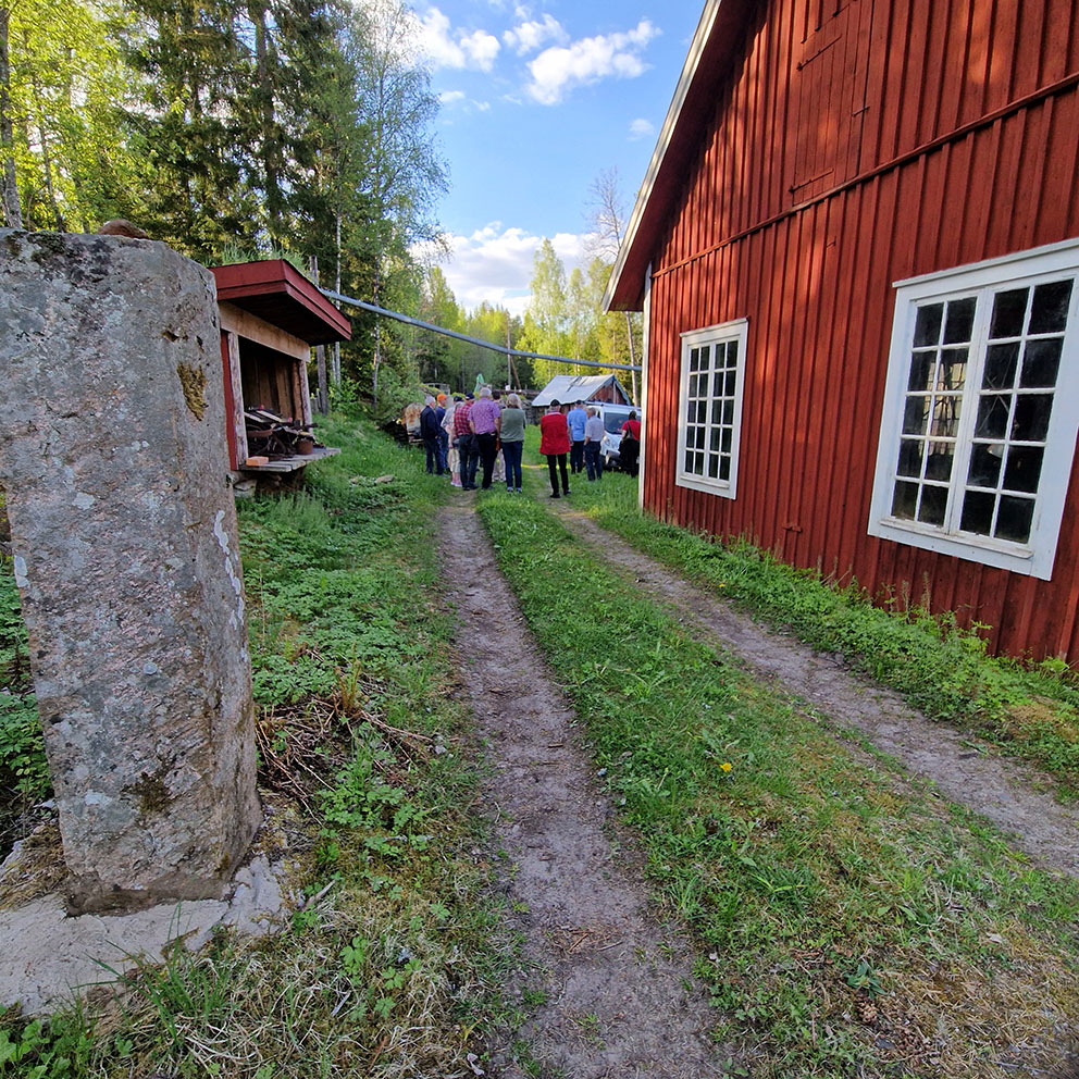 Sällskapet började vid Kvarnabergs hjulverkstad där verksamheten startarde 1880. Håkan berättar: – Hjulverkstaden är en av tre byggnadsminne i kommunen. Ett byggnadsminne utfärdas av Länsstyrelsen och får inte rivas. Här gjordes vagnshjul. De är gjorda av två trädslag, björk och antingen ask eller ek. Maskinerna inne i verkstaden är från 1800-talet och senast det var verksamhet här var 1965. Intill här rinner Horsån som börjar i Braskabo, rinner ut i fyra sjöar och ett antal gölar på vägen ner till Munksjö. Horsån ansluter sig därefter till Lagan.