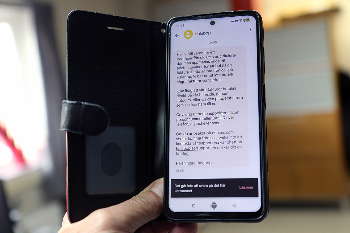 "Hej! Vi vill varna för ett bedrägeriförsök. Ett sms cirkulerar där man uppmanas ringa ett telefonnummer för att betala en faktura. Detta är inte från oss på Halebop. Vi ber er att inte betala några fakturor via telefon.