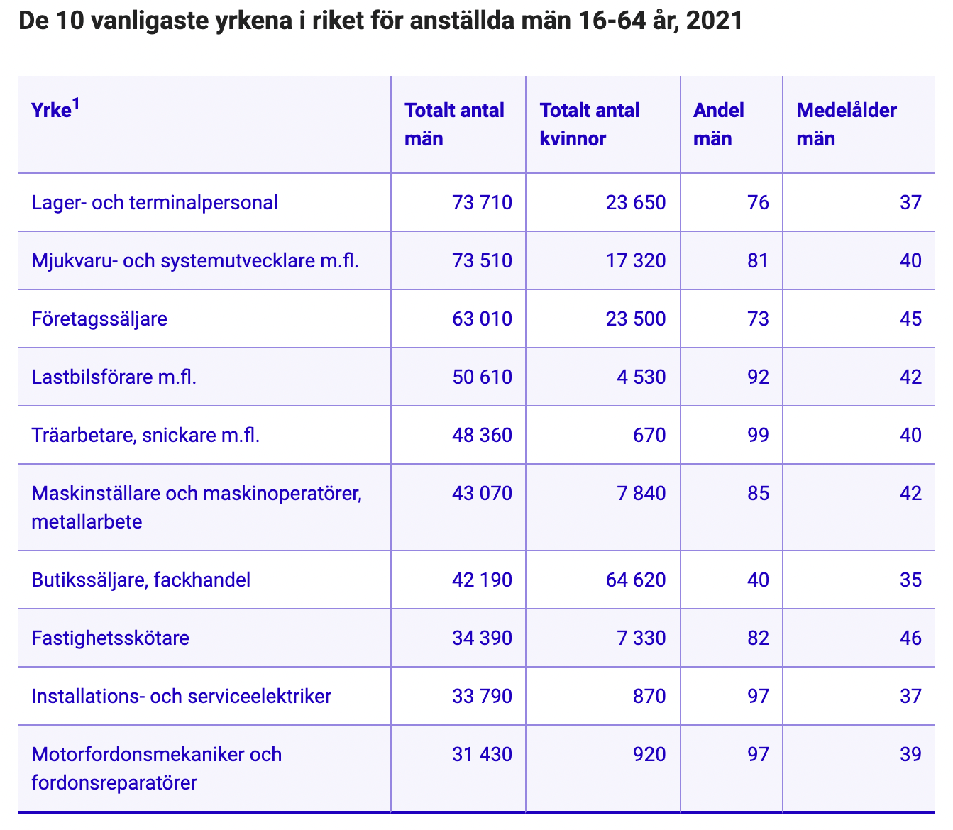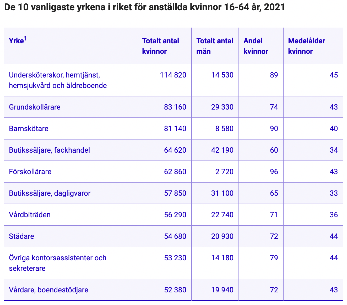 På andra plats kommer grundskolelärare och därefter butikssäljare inom fackhandeln. Även dessa yrken domineras av kvinnor. Det är först på fjärde och femte plats vi återfinner yrken som domineras av män, nämligen lager- och terminalpersonal samt mjukvaru- och systemutvecklare.