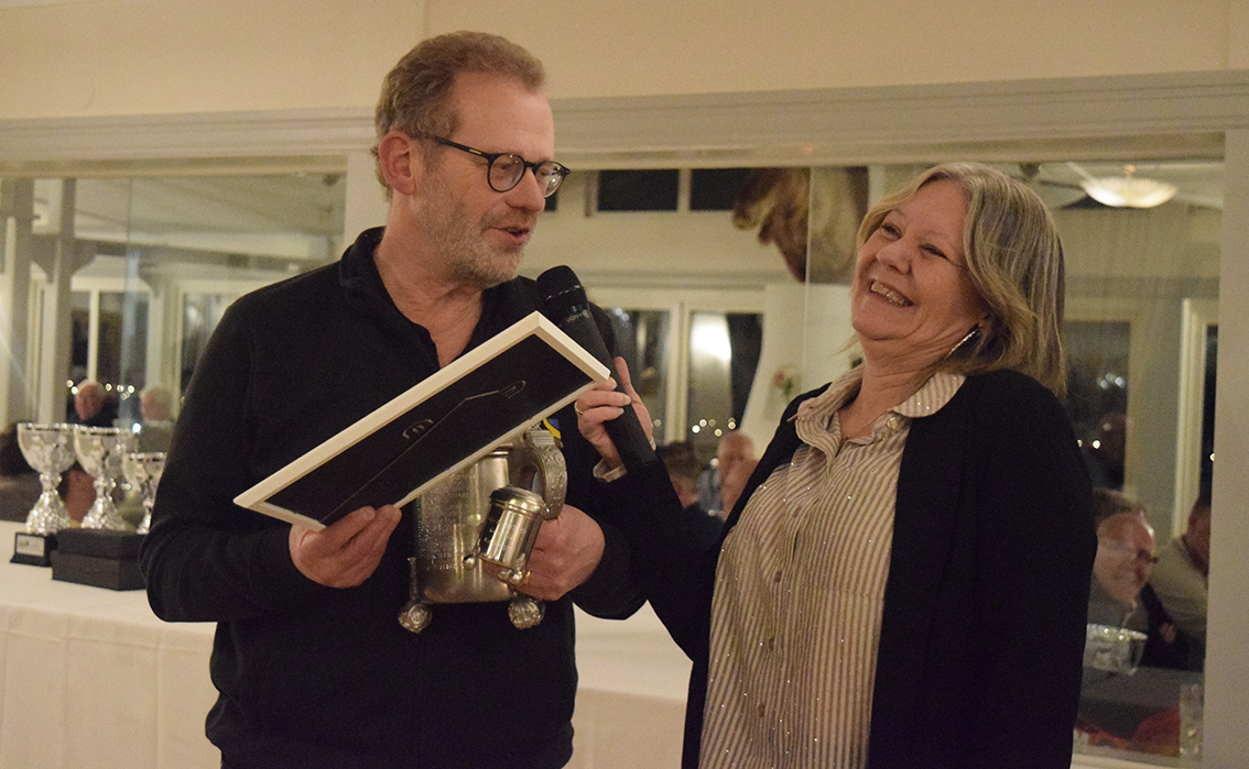 Pia Thulin, ordförande i Smålands Bilsportförbund, intervjuade klubbkamraten Mats Bergman som vann Olle Westerlunds Kanna. Bild: Sara Mejving