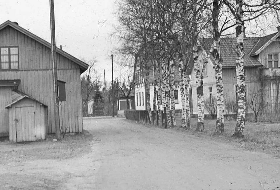 I huset till vänster bodde Lennart som liten. Huset låg på Östergatan i Vaggeryd. Till höger ses Ogells hus och gamla Sparbankshuset.