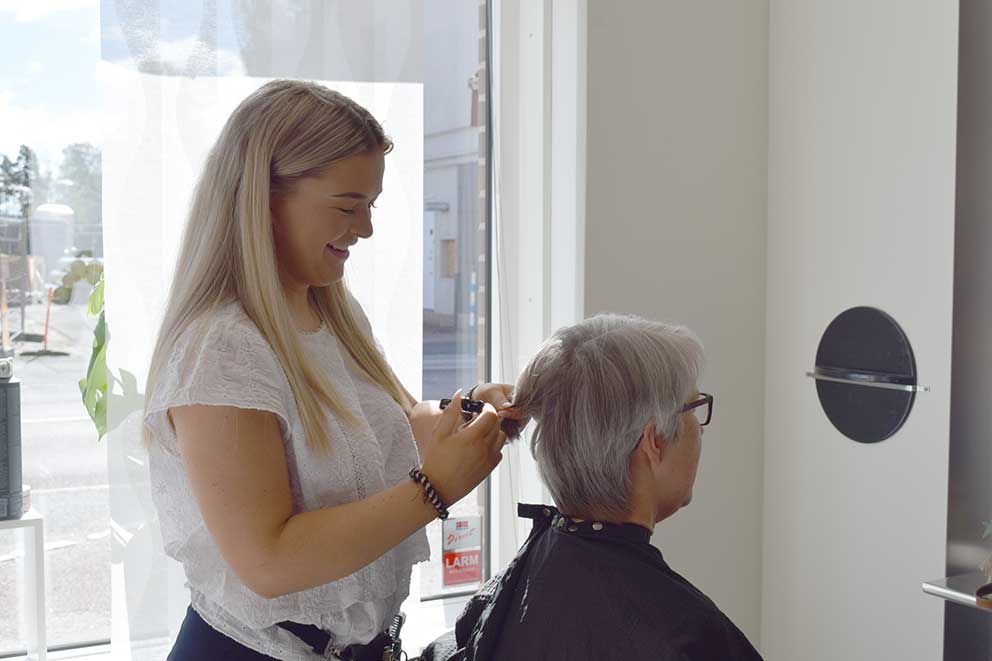– Här får jag ta emot alla olika sorters behandlingar och klippningar och jag har varit fullbokad sedan jag tog tog studenten. Just nu kämpar jag med att hålla tiden, skrattar Hilda och nämner i nästa andetag att hon nu är ”nere” på samma tid som sina kollegor.